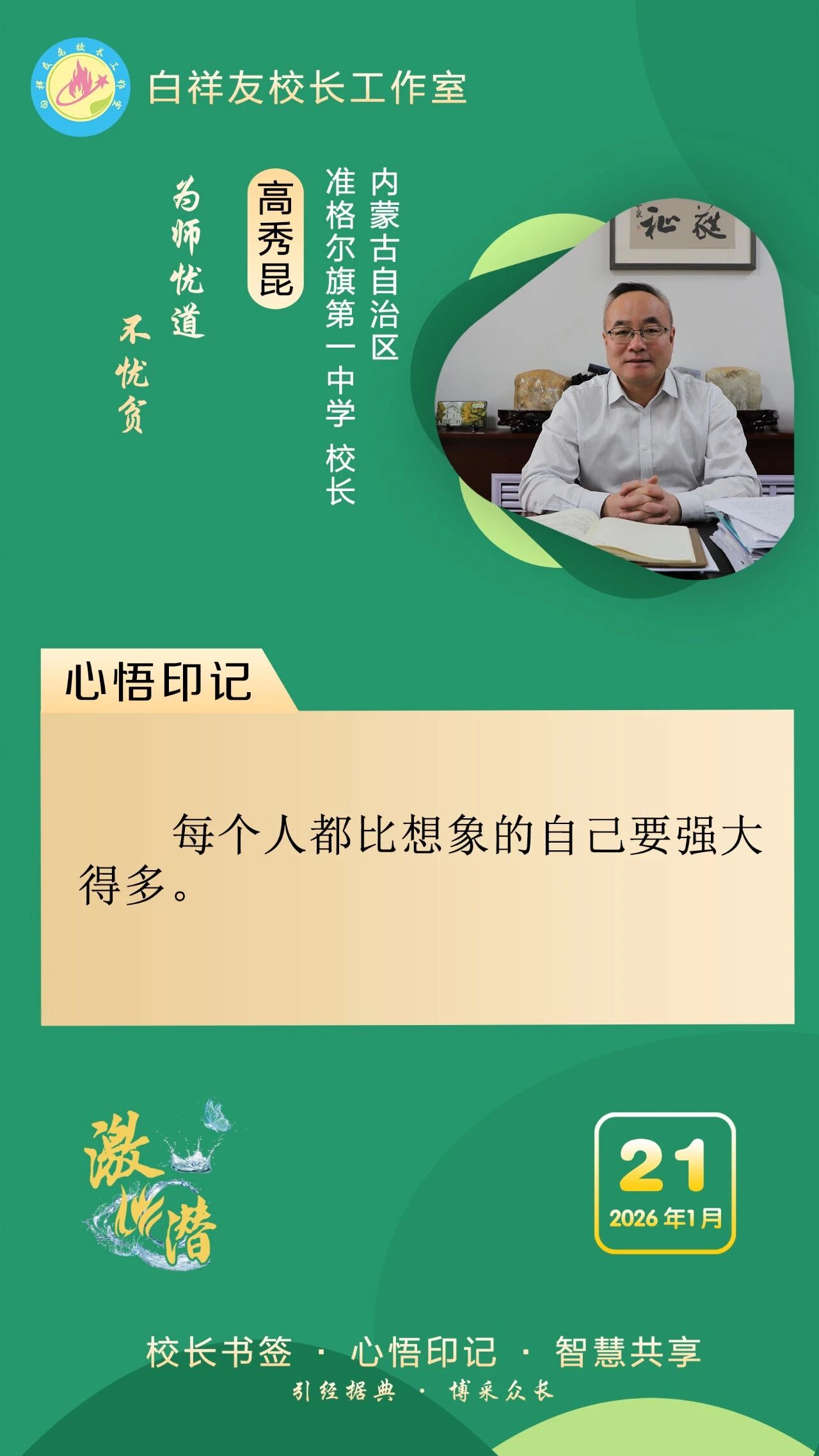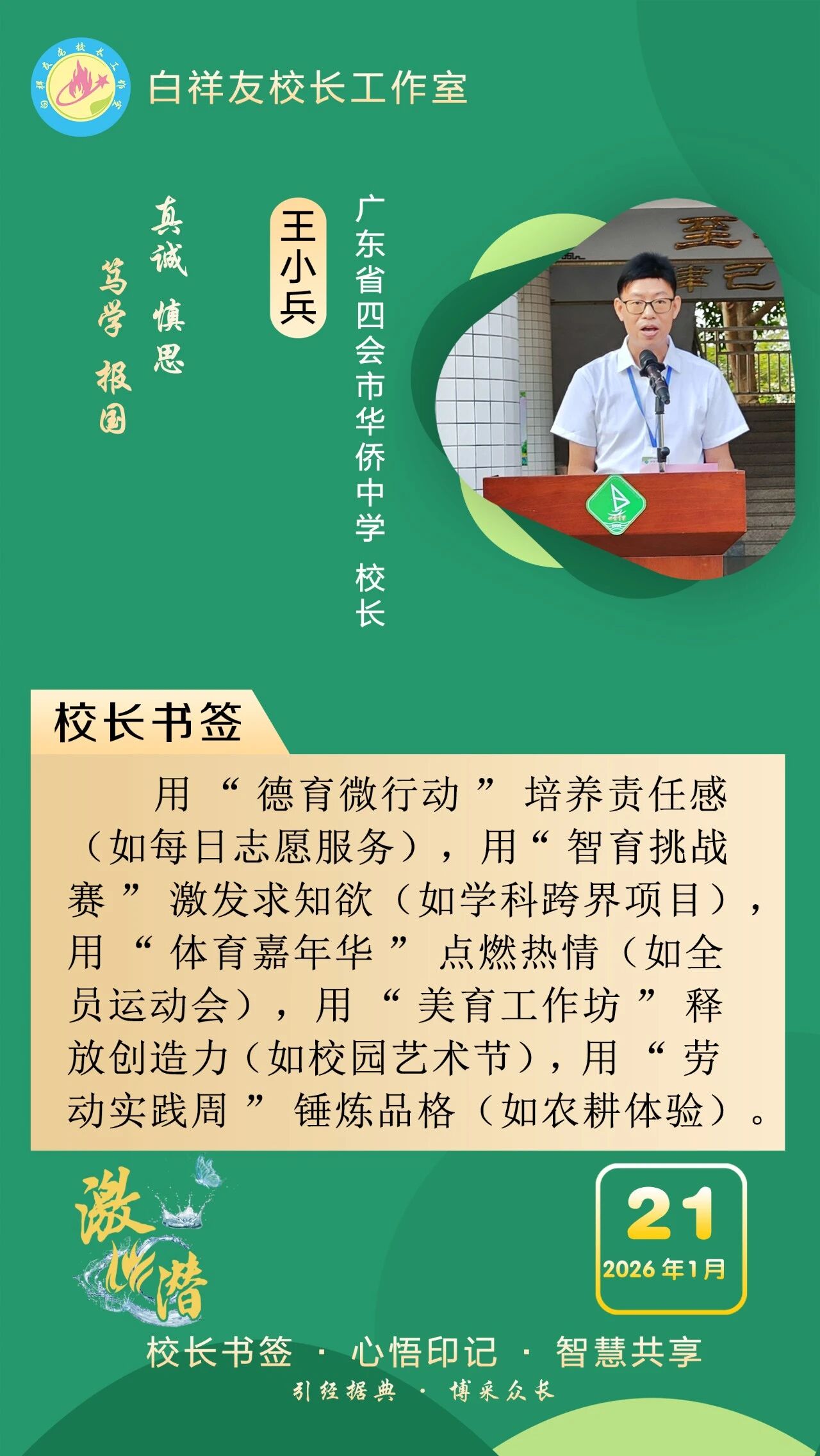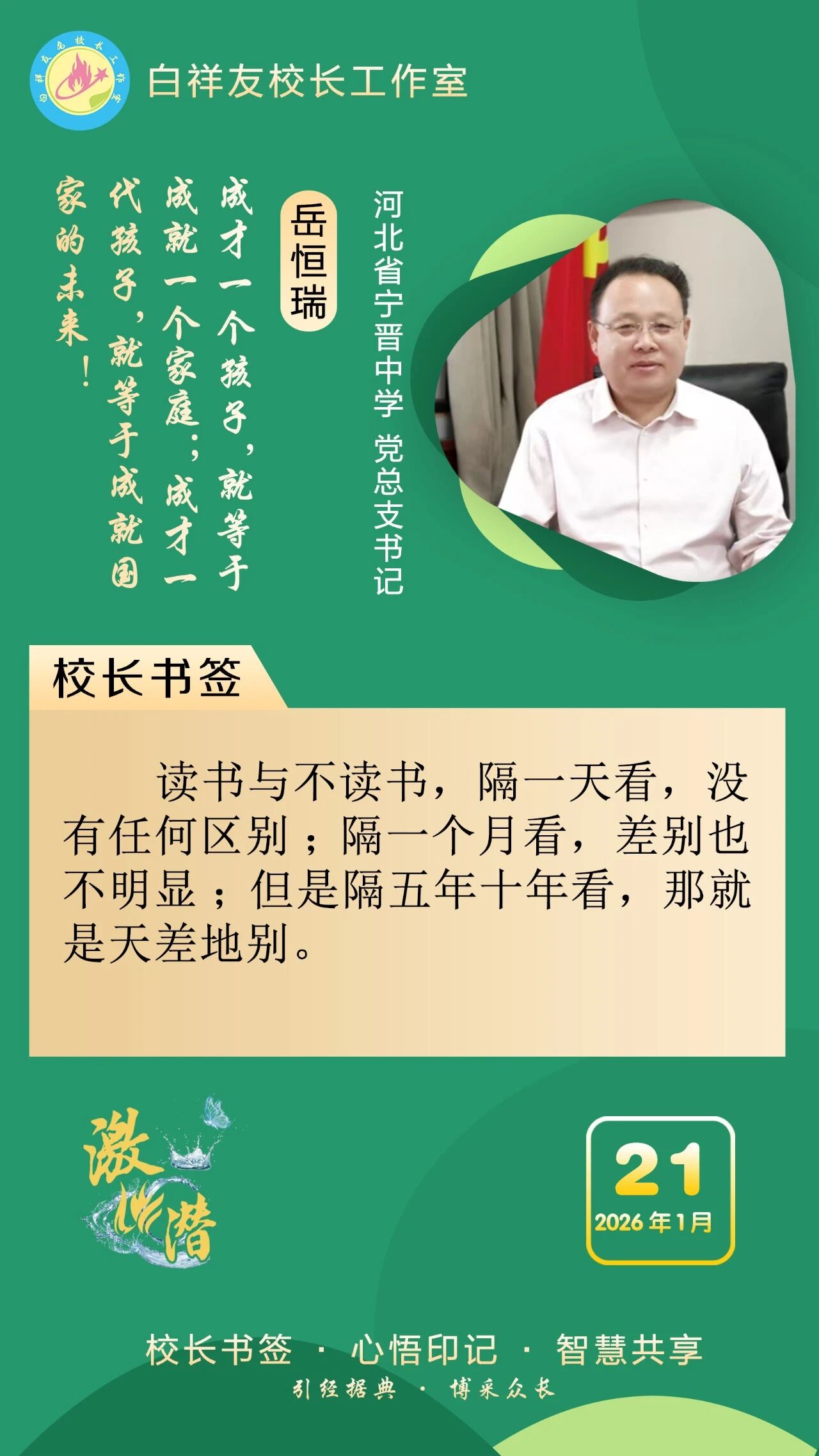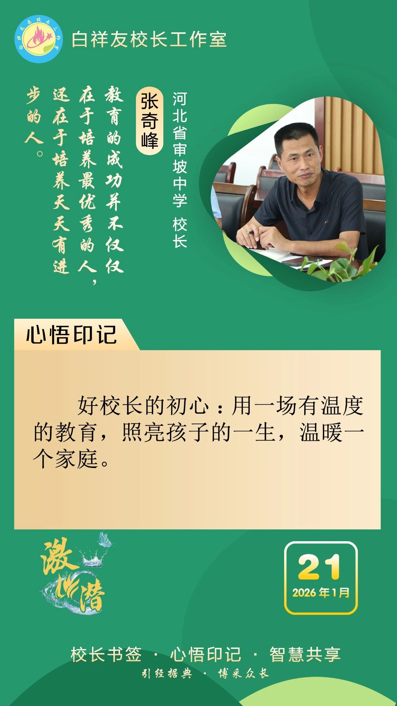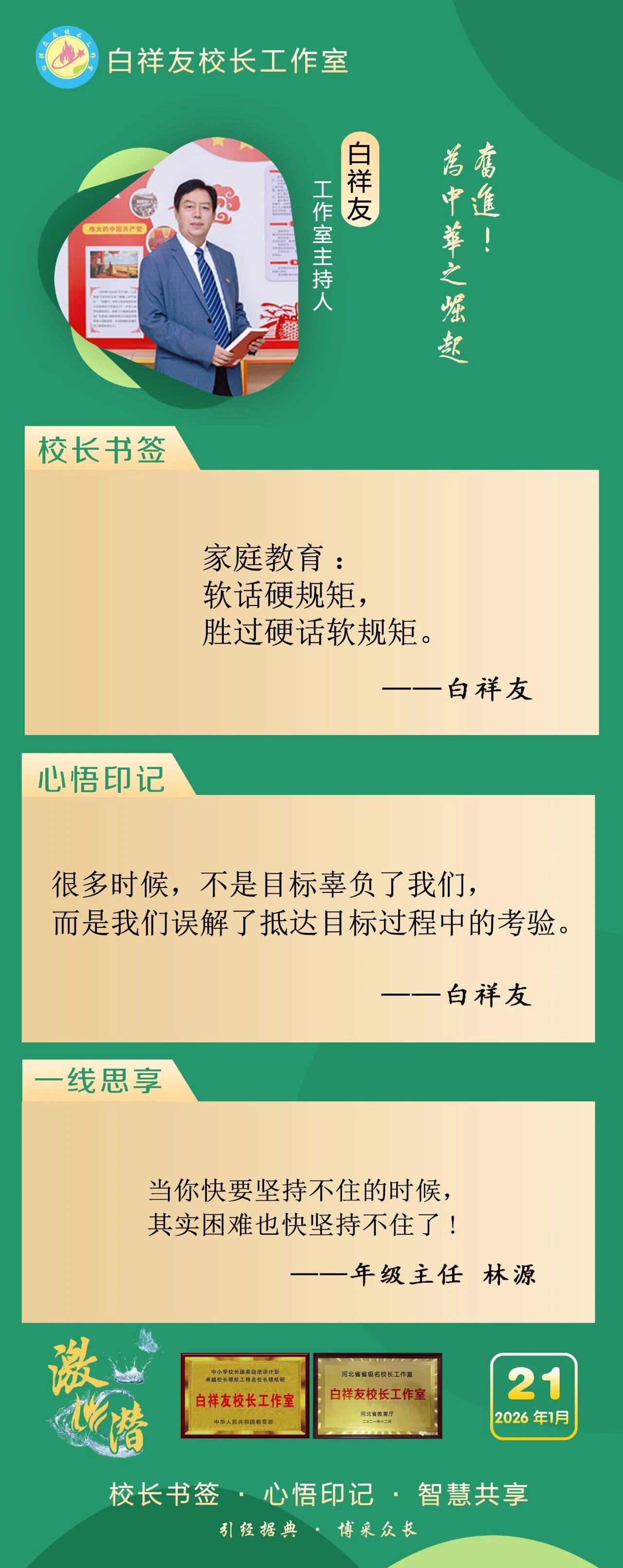 “白祥友校长工作室”成立于2019年4月,是教育部“国培计划”中小学名校长领航工程、河北省首批名校长工作室,目前省内外成员校59所。工作室坚持“资源共享、智慧共融、互助共赢”理念,已成为思想碰撞的交流场,资源共享的品牌站,成果展示的辐射源。 点赞 +1 微博 微信 我要评论 发布 相关推荐 衡水市名校长大讲堂在衡水十三中举办 教育部中小学校长培训办公室于维涛主任作专场报告 教育大观 01-19 白祥友校长工作室成员带队参观衡水十三中 教育大观 2024-05-22 “白祥友校长工作室”成员校石家庄十五中百余教师来衡水十三中参观 教育大观 2024-04-01 热门 一天 三天 一周 1 新春走基层|“西瓜育苗专业村”的新春茶话会 2 河北衡水:花卉市场年味浓,市民购花迎新春 3 衡水消防指战员: 缺席团圆,只为守护万家团圆 4 小张解惑记 5 春节我在岗 | 国网枣强县供电公司朱金魁:坚守供电一线 守护万家灯火 6 衡水冀州区:春节期间冀州老街人气旺 民俗风情引客来 7 “混搭”种养让智慧农业火出圈 8 勇往直前 共同开创更加美好的未来 ——习近平总书记在二〇二六年春节团拜会上的讲话凝聚力量催人奋进 9 央媒省媒关注衡水因地制宜发展新质生产力 10 学习新语丨总书记的马年祝福 1 30余只天鹅飞抵衡水湖 新春添景拉开春季候鸟迁徙大幕 2 【新春走基层】企业有“动”“静” 园区“筑巢”忙 3 【新春走基层】“老产业”装上“新大脑” 4 马年新春里的阜城剪纸:老手艺焕新彩 小乡村启新程 5 安平:花灯会里“演”大戏 NPC互动引客来 6 衡水湖:一湖清水出鲜鱼 渔家灶台年味浓 7 衡水市阜城县蒋坊乡: 用心用情“迎老乡” 牵线搭桥“建家乡” 8 氛围感拉满 衡水市公交车“迎新春”主题车厢已上线 9 【新春走基层】一街烟火 满城年味——春节前夕桃城区庆丰街夜市见闻 10 【新春走基层】 桃城区赵家圈镇贡家圈村:年味飘香话振兴 干群同心向未来 1 衡水市马文化展览精彩亮相 市民沉浸式感受中华马文化 2 【新春走基层】 赶大集 办年货 品年味 衡水市冀州新发地年货大集火热开市 3 举超越之力 书跨越之绩 ——衡水滨湖新区志臻中学2025年办学成果全景回眸 4 点亮衡湖夜·万家中国年 衡水湖新春游园灯会启幕 5 【新春走基层】寻年味 叙乡情 促和谐 衡水市冀州社区新春活动温情满溢 6 【新春走基层】马年启新岁 民俗闹小年——2026年全国春节“村晚”示范展示点暨武强县第36届民俗花会展演 7 【“十五五”开局看衡水】把家“叠”起来 快递到全球 ——河北众鑫合装配式房屋制造探访 8 习近平北京行丨让老年人都有幸福美满的晚年——走进“吾老·新街”养老服务街区 9 守护“舌尖上的年味” 衡水市开展年夜饭食品安全专项检查 10 【新春走基层】包饺子 写春联 送祝福 桃城区城东社区小年有点儿甜 广告 广告 广告 24小时 1 窝头香、糖果甜、人心暖!衡水冀州区东方老年公寓:这里就是咱的家 2 非遗正青春 书店过大年 3 新春走基层丨警长老高“平事儿”有招 4 春节我在岗 | 衡水四院2025:时光长河中的奋进华章 5 春节我在岗 | 衡水车务段客运车间张志:坚守担使命 温情润归途 6 骆驼湾的好日子 7 1月河北生态补水量创历年同期最高纪录 8 北方首个国家中药材产品检验检测中心落户河北 9 今年河北将实施11个衔接京津干线公路项目 10 创意微视频|文物界八骏组团拜年,马力全开送福啦!