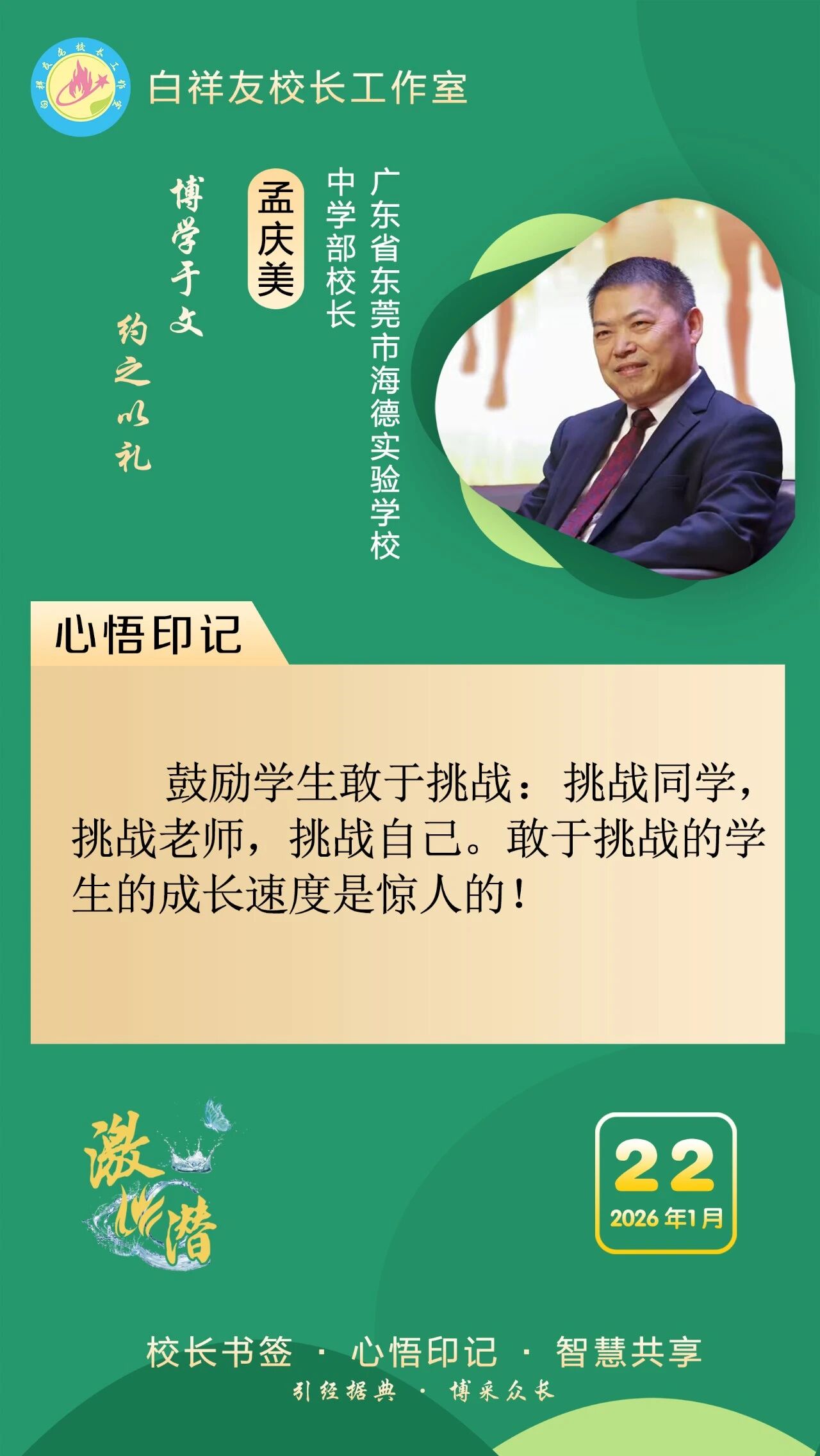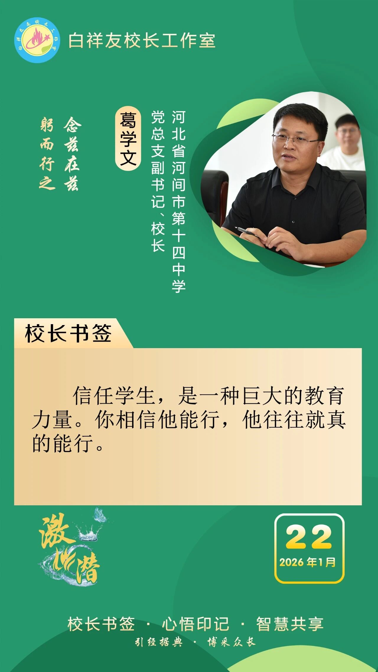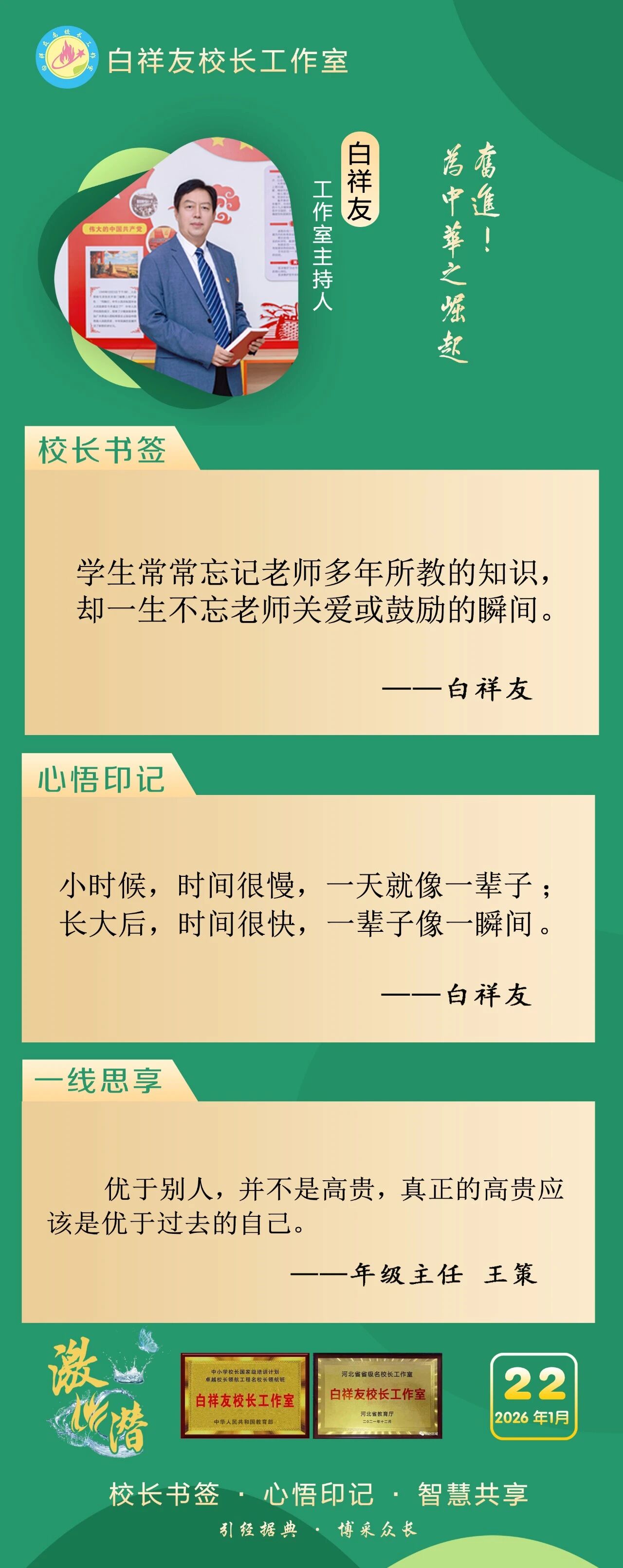 “白祥友校长工作室”成立于2019年4月,是教育部“国培计划”中小学名校长领航工程、河北省首批名校长工作室,目前省内外成员校59所。工作室坚持“资源共享、智慧共融、互助共赢”理念,已成为思想碰撞的交流场,资源共享的品牌站,成果展示的辐射源。 点赞 +1 微博 微信 我要评论 发布 相关推荐 衡水市名校长大讲堂在衡水十三中举办 教育部中小学校长培训办公室于维涛主任作专场报告 教育大观 01-19 白祥友校长工作室成员带队参观衡水十三中 教育大观 2024-05-22 “白祥友校长工作室”成员校石家庄十五中百余教师来衡水十三中参观 教育大观 2024-04-01 热门 一天 三天 一周 1 新春走基层|“西瓜育苗专业村”的新春茶话会 2 河北衡水:花卉市场年味浓,市民购花迎新春 3 衡水消防指战员: 缺席团圆,只为守护万家团圆 4 小张解惑记 5 春节我在岗 | 国网枣强县供电公司朱金魁:坚守供电一线 守护万家灯火 6 衡水冀州区:春节期间冀州老街人气旺 民俗风情引客来 7 “混搭”种养让智慧农业火出圈 8 勇往直前 共同开创更加美好的未来 ——习近平总书记在二〇二六年春节团拜会上的讲话凝聚力量催人奋进 9 央媒省媒关注衡水因地制宜发展新质生产力 10 学习新语丨总书记的马年祝福 1 30余只天鹅飞抵衡水湖 新春添景拉开春季候鸟迁徙大幕 2 【新春走基层】企业有“动”“静” 园区“筑巢”忙 3 【新春走基层】“老产业”装上“新大脑” 4 马年新春里的阜城剪纸:老手艺焕新彩 小乡村启新程 5 安平:花灯会里“演”大戏 NPC互动引客来 6 衡水湖:一湖清水出鲜鱼 渔家灶台年味浓 7 衡水市阜城县蒋坊乡: 用心用情“迎老乡” 牵线搭桥“建家乡” 8 氛围感拉满 衡水市公交车“迎新春”主题车厢已上线 9 【新春走基层】一街烟火 满城年味——春节前夕桃城区庆丰街夜市见闻 10 【新春走基层】 桃城区赵家圈镇贡家圈村:年味飘香话振兴 干群同心向未来 1 衡水市马文化展览精彩亮相 市民沉浸式感受中华马文化 2 【新春走基层】 赶大集 办年货 品年味 衡水市冀州新发地年货大集火热开市 3 举超越之力 书跨越之绩 ——衡水滨湖新区志臻中学2025年办学成果全景回眸 4 点亮衡湖夜·万家中国年 衡水湖新春游园灯会启幕 5 【新春走基层】寻年味 叙乡情 促和谐 衡水市冀州社区新春活动温情满溢 6 【新春走基层】马年启新岁 民俗闹小年——2026年全国春节“村晚”示范展示点暨武强县第36届民俗花会展演 7 【“十五五”开局看衡水】把家“叠”起来 快递到全球 ——河北众鑫合装配式房屋制造探访 8 习近平北京行丨让老年人都有幸福美满的晚年——走进“吾老·新街”养老服务街区 9 【新春走基层】包饺子 写春联 送祝福 桃城区城东社区小年有点儿甜 10 守护“舌尖上的年味” 衡水市开展年夜饭食品安全专项检查 广告 广告 广告 24小时 1 看图学习·热气腾腾的中国年丨“把幸福生活过得更好” 总书记记挂小家冷暖 2 学习·知行丨“典”话新春 习近平这些话暖心又提气 3 窝头香、糖果甜、人心暖!衡水冀州区东方老年公寓:这里就是咱的家 4 非遗正青春 书店过大年 5 新春走基层丨警长老高“平事儿”有招 6 春节我在岗 | 衡水四院2025:时光长河中的奋进华章 7 春节我在岗 | 衡水车务段客运车间张志:坚守担使命 温情润归途 8 骆驼湾的好日子 9 1月河北生态补水量创历年同期最高纪录 10 北方首个国家中药材产品检验检测中心落户河北