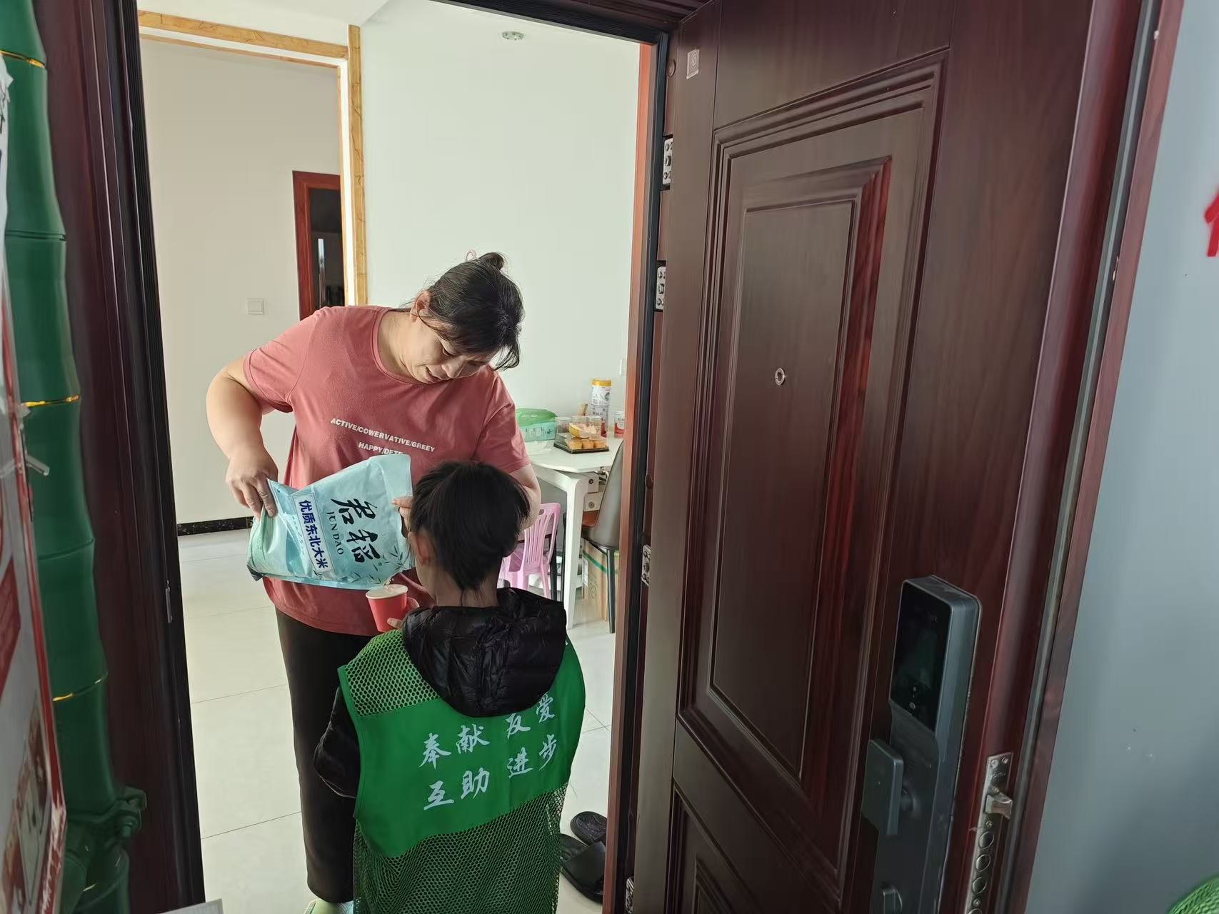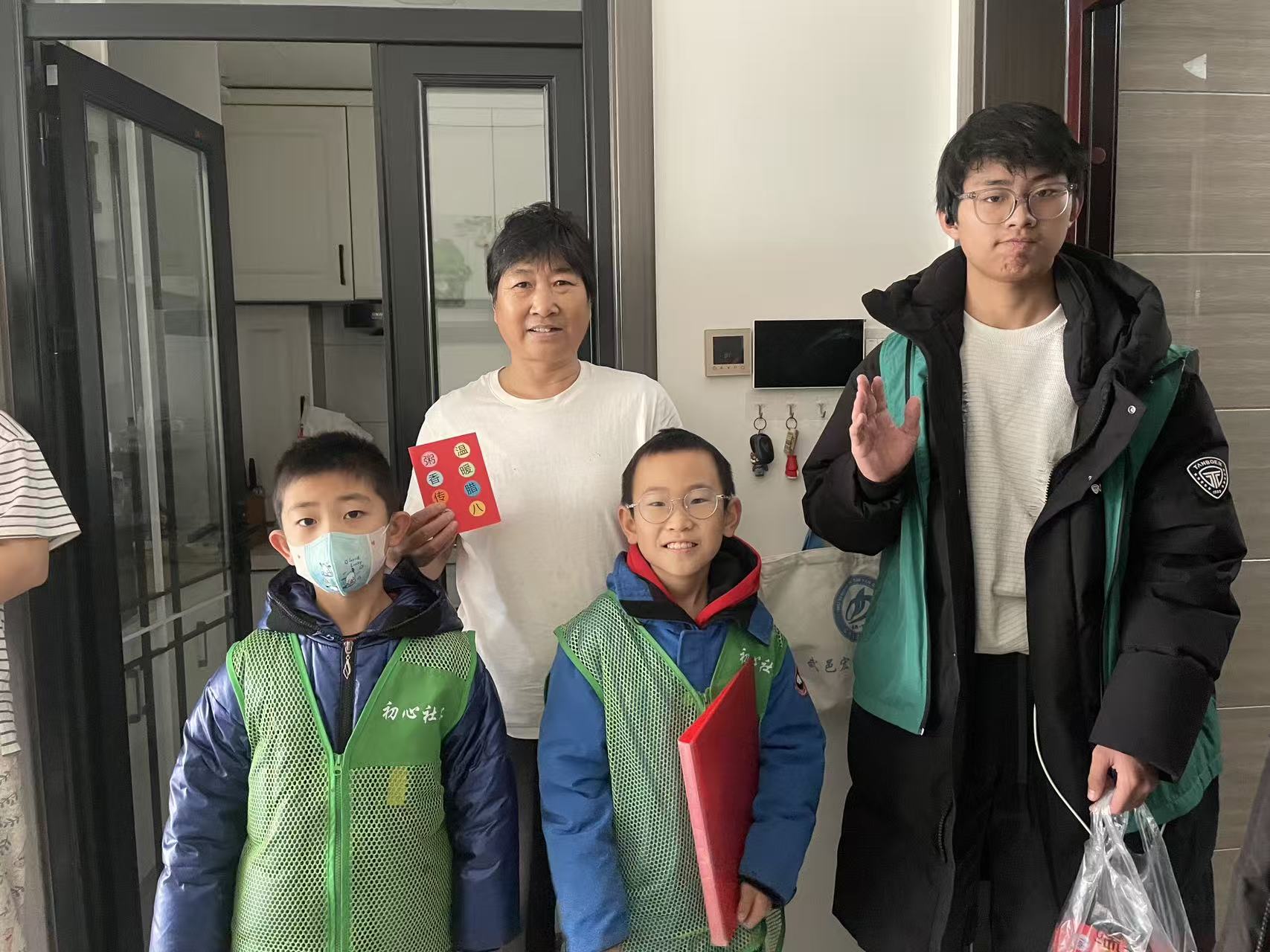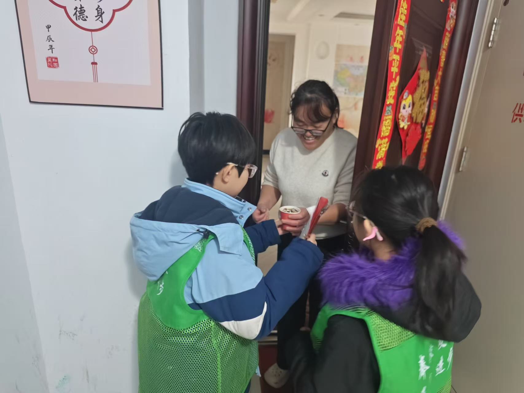 随后,小朋友们轻轻叩响邻居的家门,送上自制贺卡与甜甜祝福。邻居们惊喜接过,并以象征分享与福气的一杯米粒回赠,投入孩子们手中的“百家福袋”。这一赠一收之间,陌生变得熟悉,邻里关系在温情互动中悄然升温。