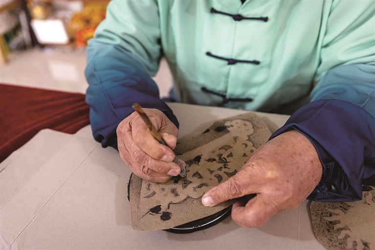 戏剧盔头制作中的足活(刻花)技艺。