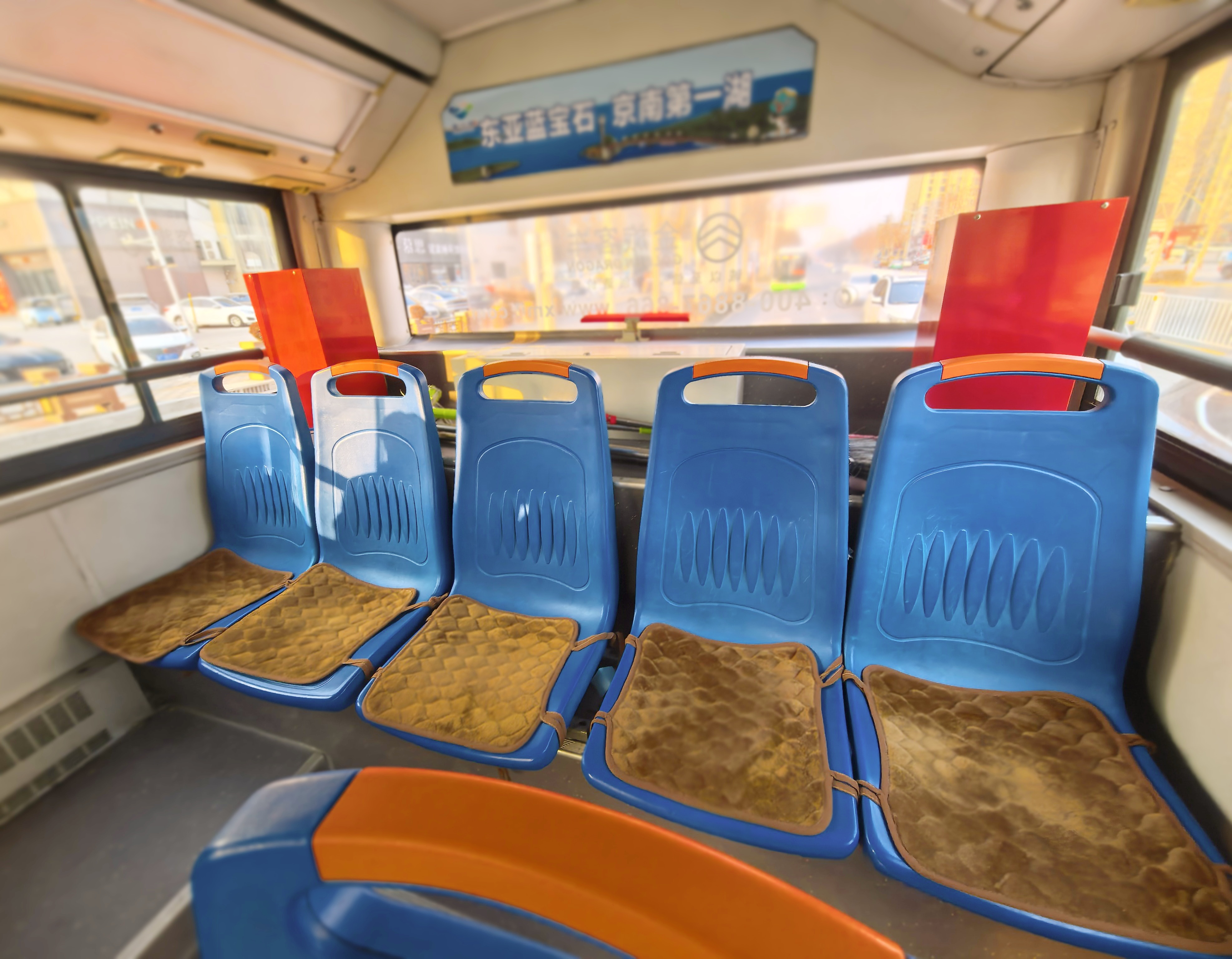 只见原本冰冷的塑料座椅上,都铺上了柔软厚实的坐垫,浅棕色的外观质朴又温馨,仿佛在无声地邀请乘客们安心就座。