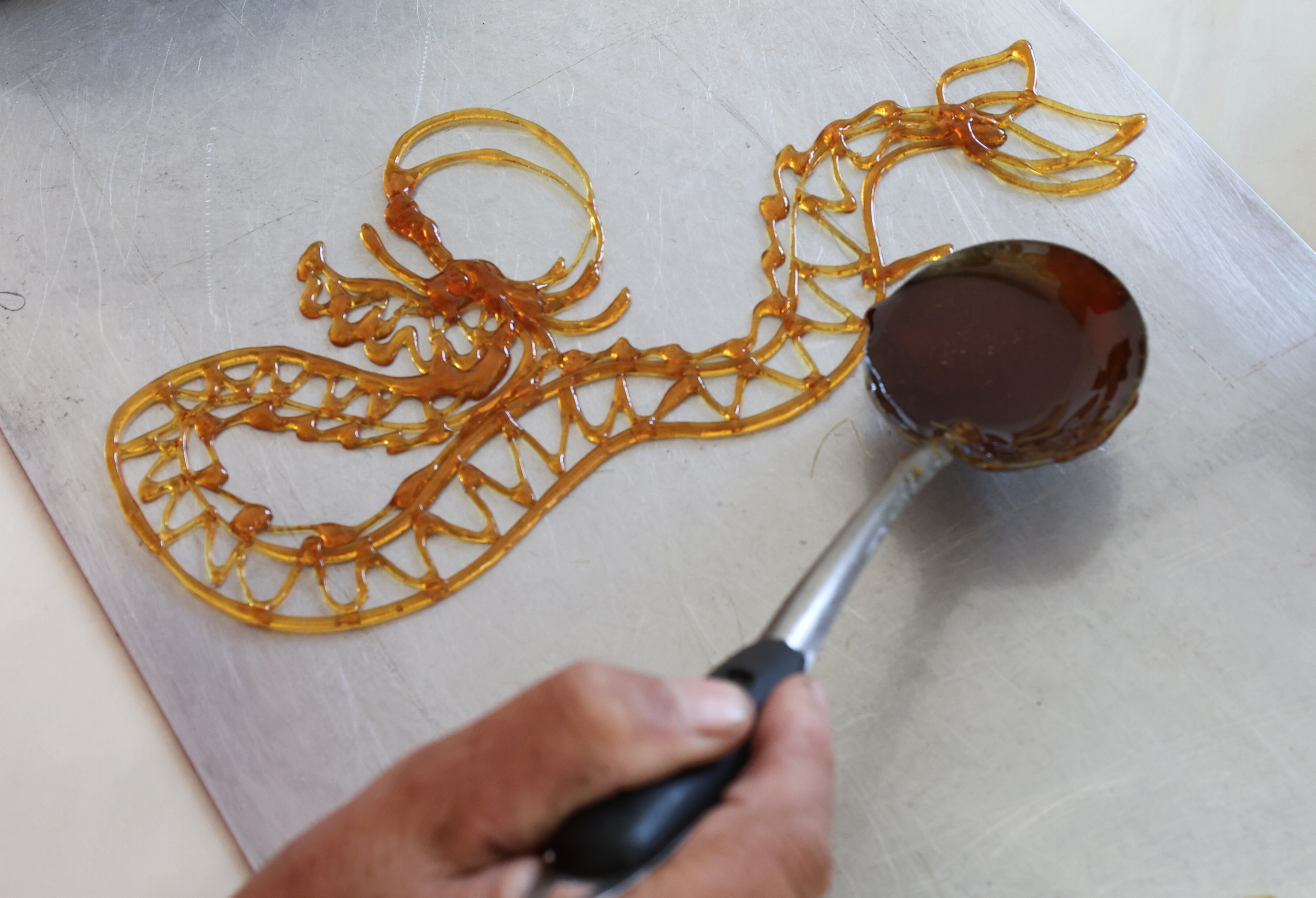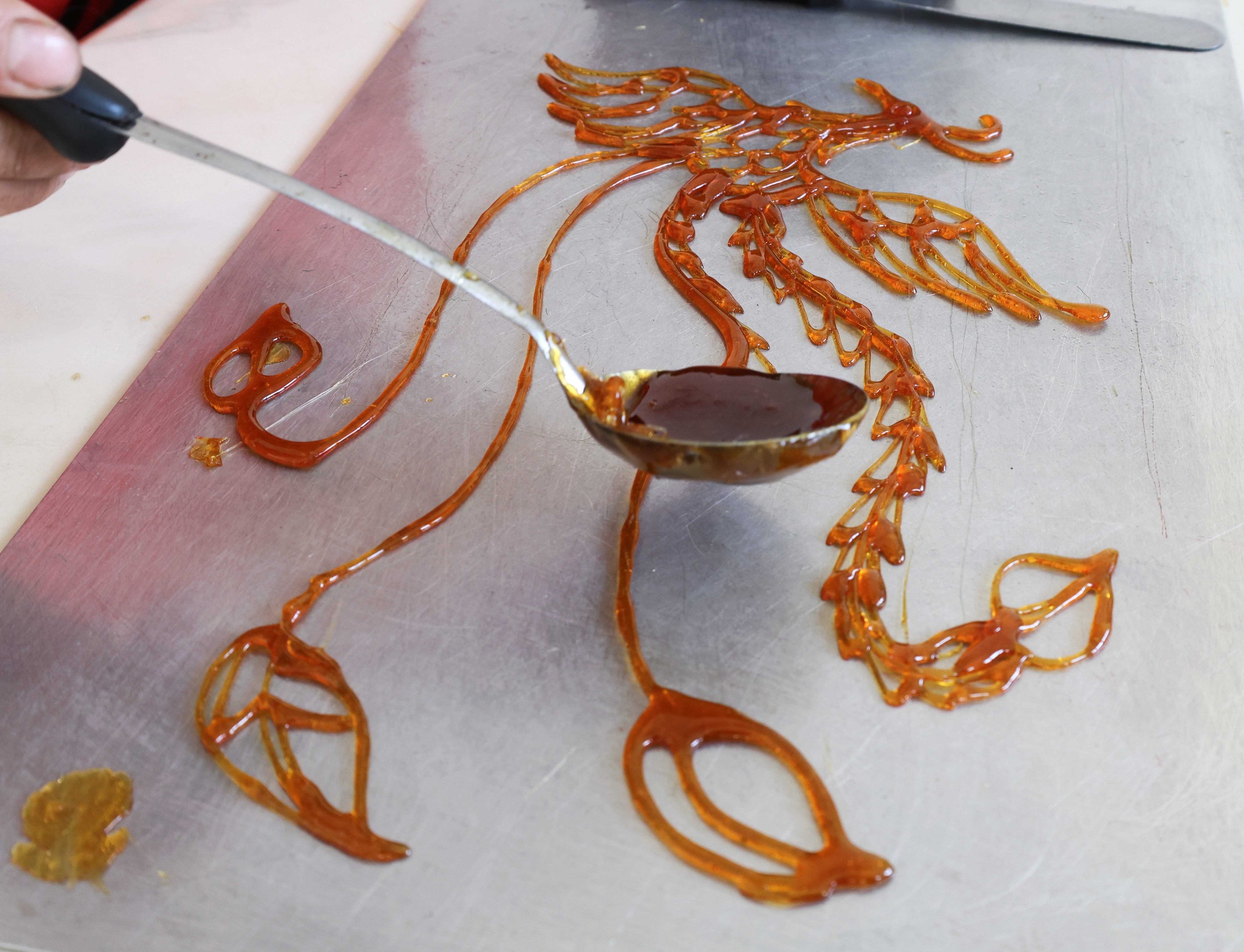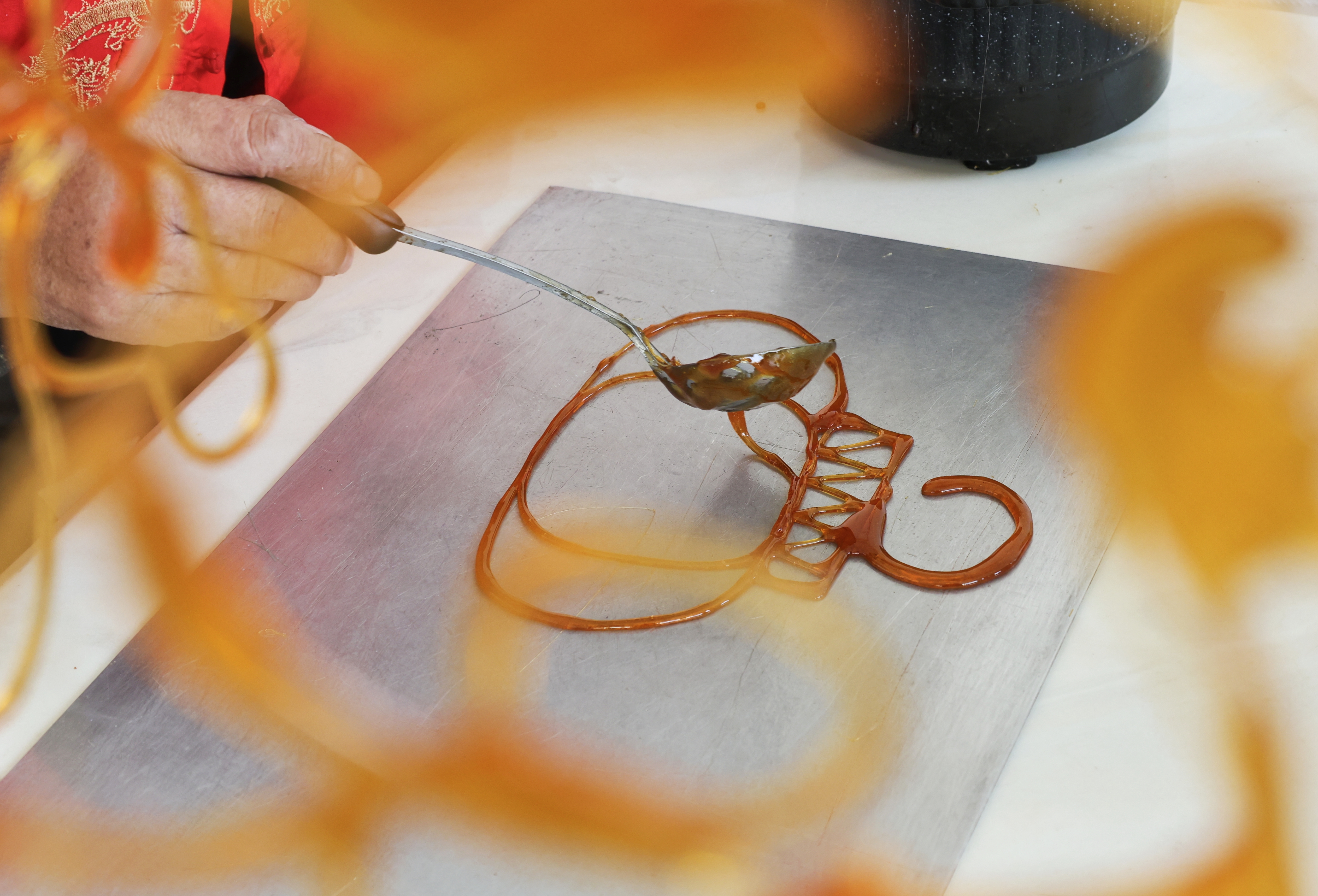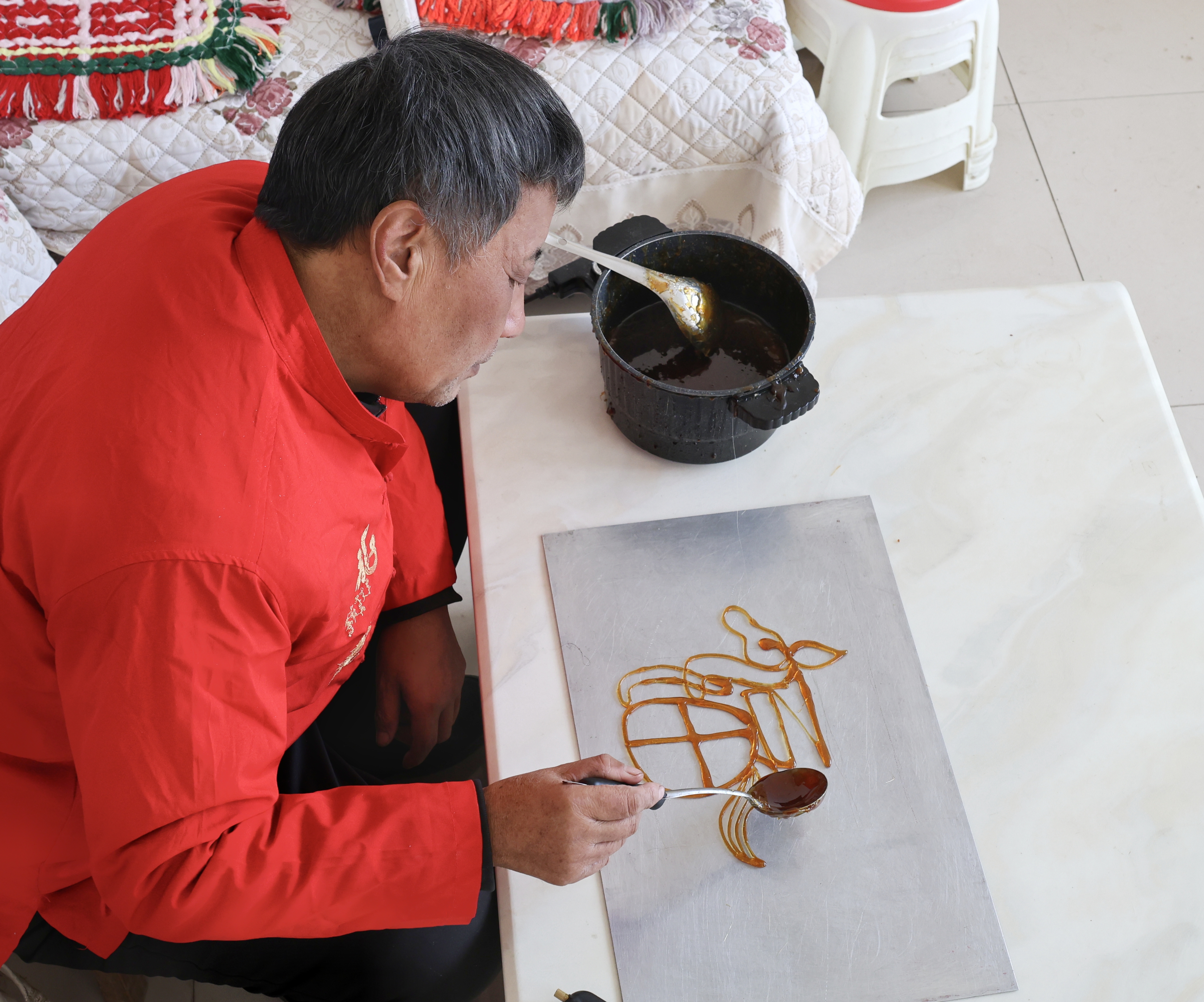 初学之路布满艰辛,熬糖便是第一道难关。“火大易糊,火小不成丝,全凭经验拿捏火候”,吴延岭回忆道。师傅传授的十二生肖图样中,龙的造型最为复杂,龙身的蜿蜒弧度、鳞片的疏密排布、爪牙的凌厉姿态,都需要精准把控糖液流速与运腕力度。为攻克难关,他利用午休与夜晚时间反复练习,在铝板上模拟创作,将每一个细节刻进脑海。“糖画没有底稿,落笔便无回头路,唯有胸有成竹才能从容下笔”,这一从师傅那里习得的核心要义,成为他坚守至今的创作准则。