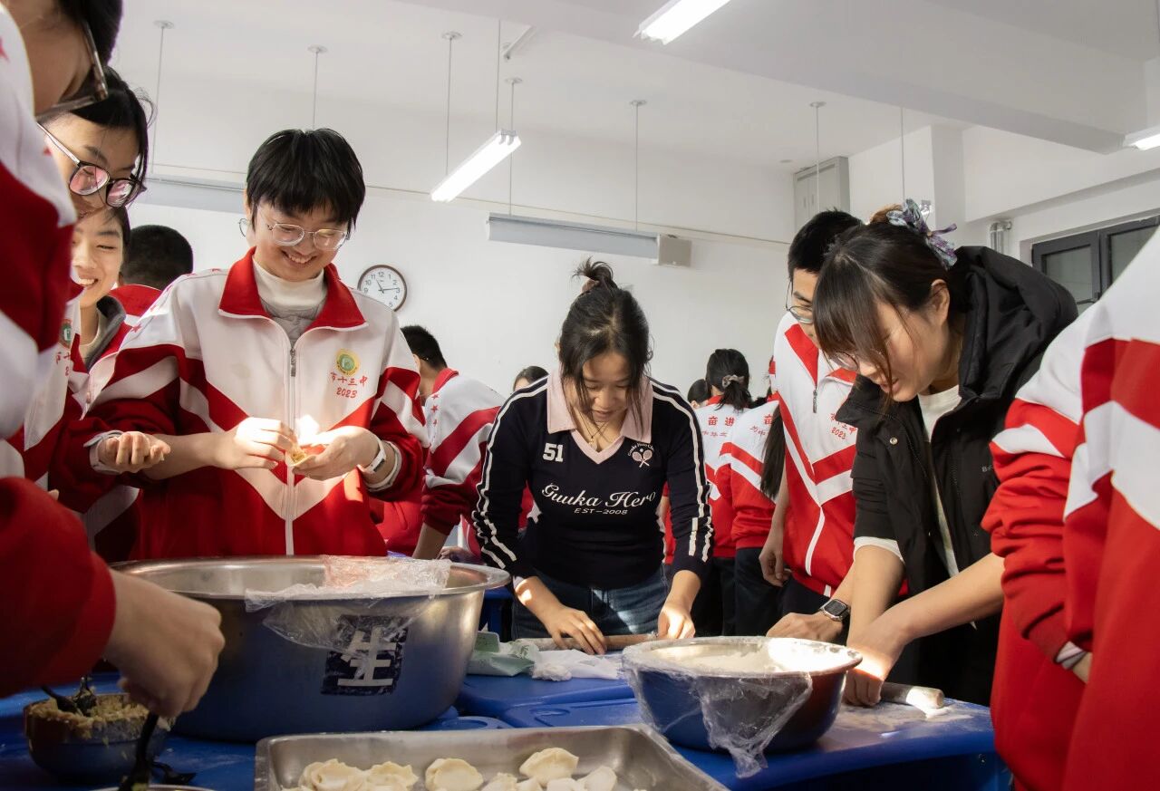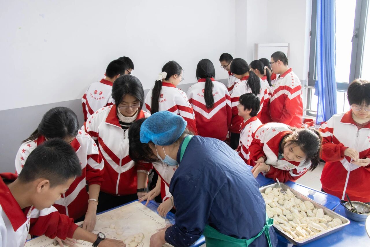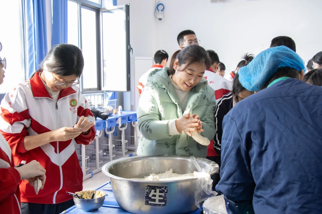 面团在掌心揉出圆润的弧度,擀面杖滚过,一张张饺子皮翩然成型。这边,家长们手法娴熟,饱满的饺子像小元宝般整齐排列;那边,老师们挽起衣袖,手把手教同学们捏出漂亮的褶子,耐心纠正着大家的手法;同学们围在桌旁,有的认真模仿,有的大胆创新,包出的饺子形态各异,却都裹满了欢喜。
