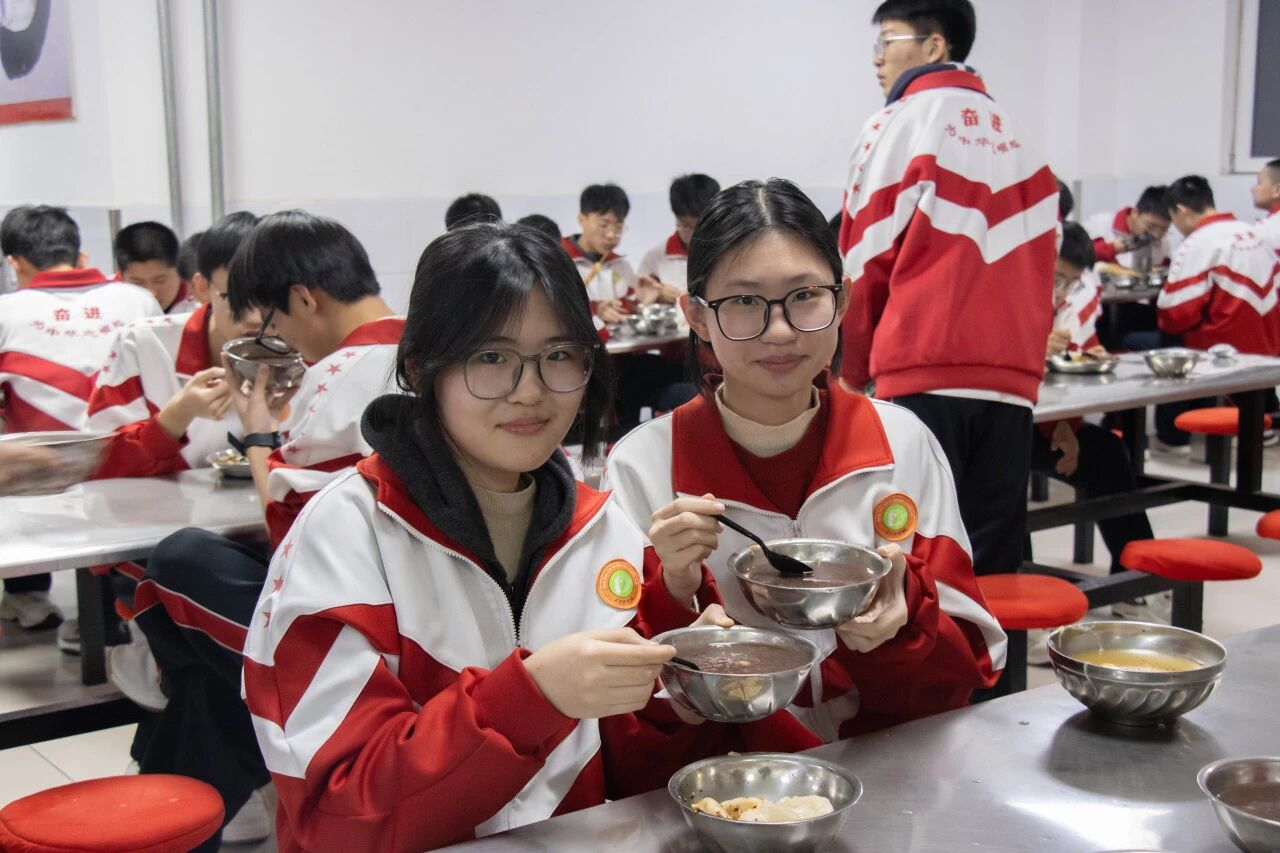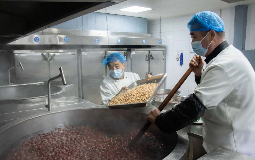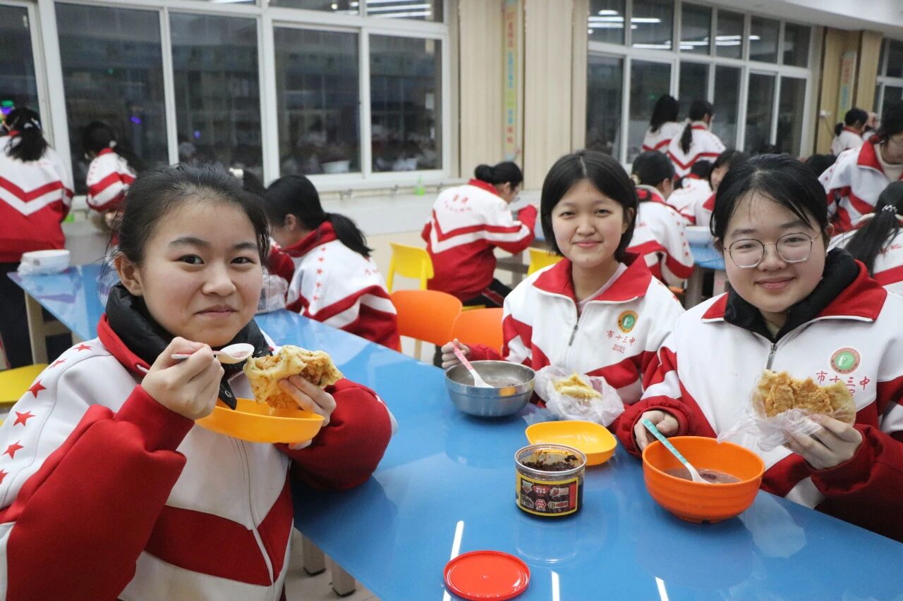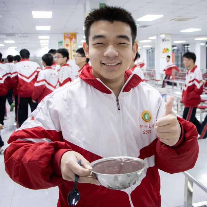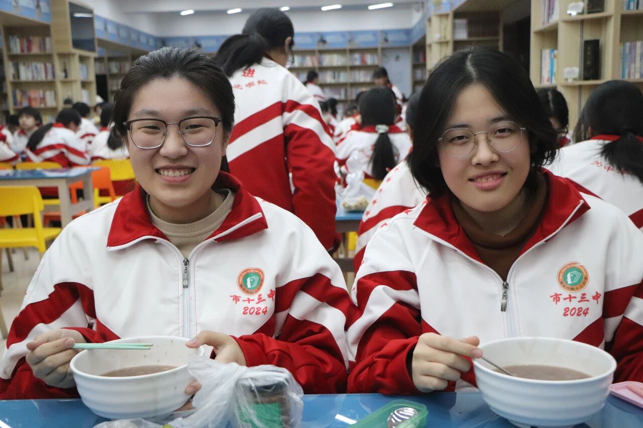 食堂的师傅们早早着手忙碌,精选的糯米、红豆、红枣、莲子等各种食材,经过反复淘洗、慢火熬煮,最终熬制成软糯香甜的粥品。咕嘟咕嘟的冒泡声里,是烟火气的升腾,更是十三中对学子们最朴素的关怀。
