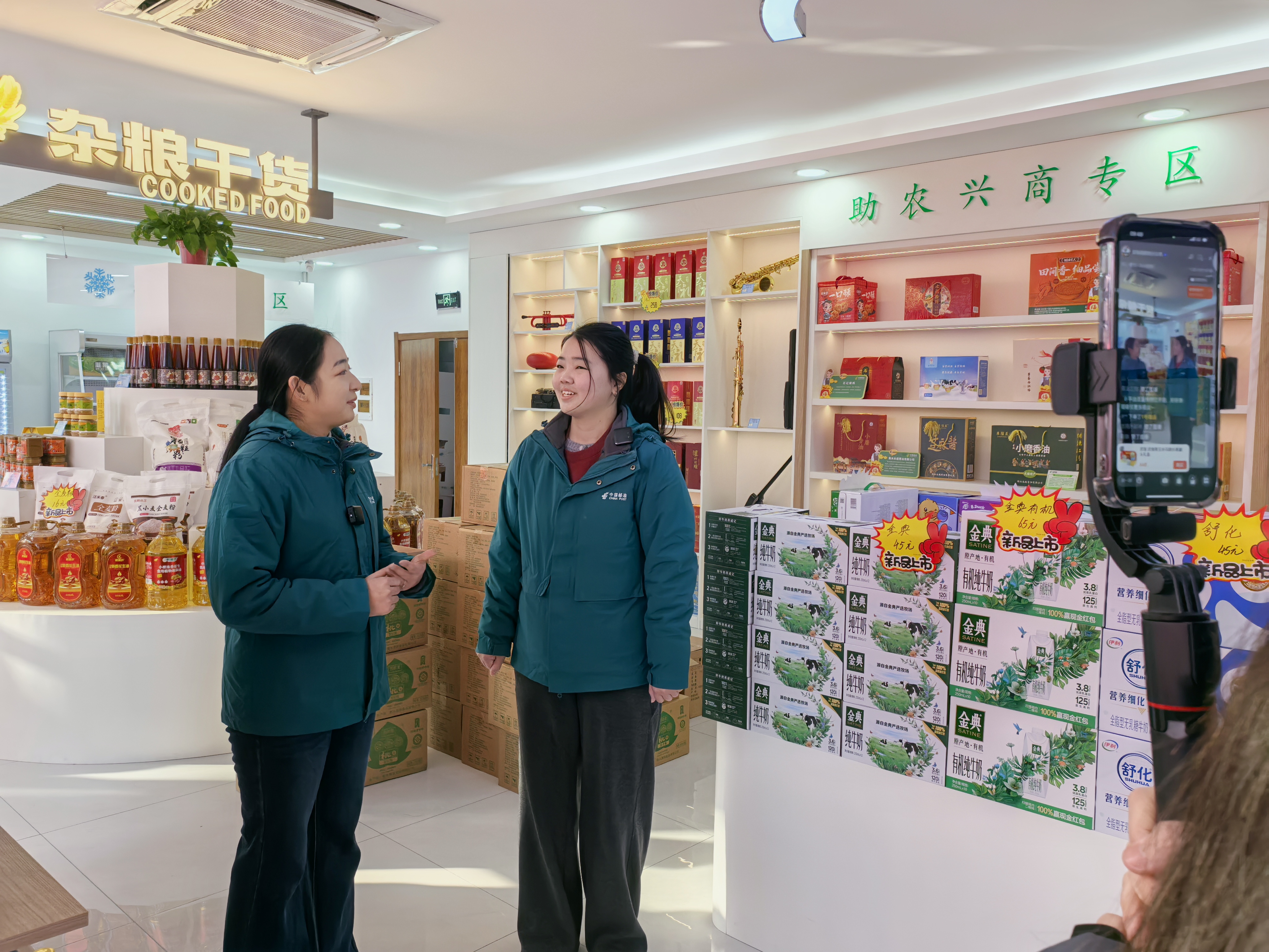 “今天咱们走到哪吃到哪!”展销中心门口,邮政主播热情的笑容和声音感染着屏幕前的观众。镜头扫过整齐排列的罐头礼盒、圆润光滑的富硒鸡蛋、色泽诱人的功能菜和现场介绍、问询、交易的人群,场景热闹非凡。
