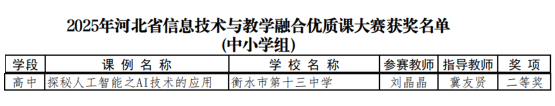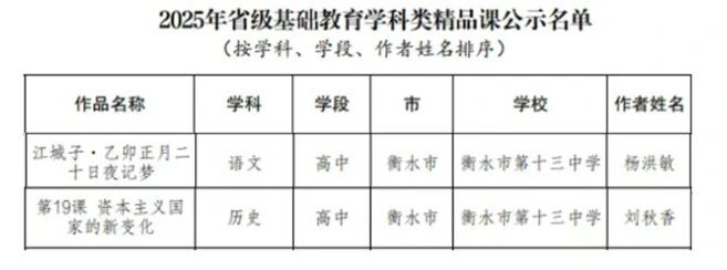 衡水十三中教师杨洪敏、刘秋香老师申报的课例成功获评2025年省级基础教育学科类精品课;刘晶晶老师在2025年河北省信息技术与教学融合优质课大赛中获中小学组二等奖;贾文雪、张磊老师获2025年河北省中小学美育教师教学能力大赛高中组三等奖;王月敬老师获2025年河北省中小学体育优质课高中组三等奖。