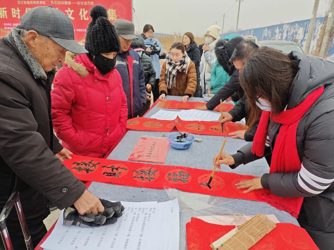 除了精彩纷呈的文艺演出,现场写春联、送春联活动更是成为文化大集的一大亮点,让年味愈发浓厚、暖意直达人心。书法老师们铺纸、蘸墨、挥毫,将吉祥寓意融入笔墨之间。不多时,“春回大地风光好,福满人间喜事多”……一副副饱含美好祝愿的春联被送到村民手中,传递着浓浓的年味儿与温暖关怀,让大家在感受文化魅力的同时,收获了实实在在的新春祝福。村民张翠梅接过春联,高兴地说:“节目好看,春联也送到心坎上了!这样的大集既有看头又有收获,希望以后经常办!”