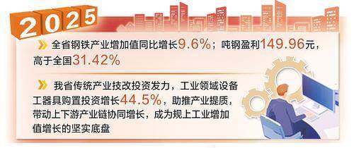 我省依托科技创新,加快推动钢铁产品由原料级向材料级转变、企业由制造商向综合服务商转型,“河北造”电工钢、汽车板、造船板、特型钢等高端产品层出不穷。“铁疙瘩”变成“金娃娃”,让钢铁提了身价,也为汽车、智能制造等下游产业添了底气。2025年,全省钢铁产业增加值同比增长9.6%;吨钢盈利149.96元,高于全国31.42%。
