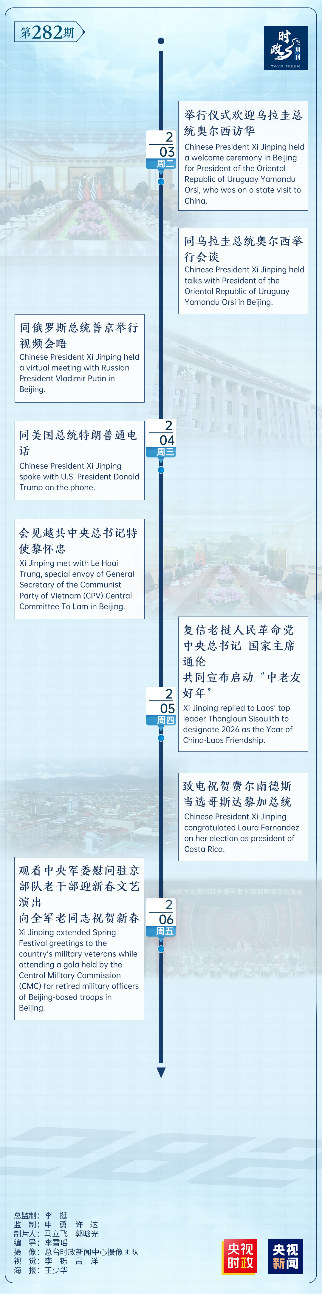 编辑:贾扬阳 来源:央视新闻客户端 原标题:时政微周刊丨总书记的一周(2月2日—2月8日) 点赞 +1 微博 微信 我要评论 发布 相关推荐 时政微周刊丨总书记的一周(3月23日—3月29日) 要闻 4天前 时政微观察丨从总书记雄安行,读懂实干精神 时政 03-27 时政微观察丨从总书记雄安行,读懂实干精神 关注 03-25 时政微纪录丨千年大计 只争朝夕——习近平总书记赴河北雄安新区考察纪实 时政 03-25 时政微纪录丨习近平总书记雄安行 时政 03-24 时政微纪录|智造新生——总书记寄望的智造担当 要闻 03-19 时政微纪录|幸福新语——总书记称赞的美丽产业 要闻 03-18 时政微周刊丨总书记的一周(3月9日—3月15日) 要闻 03-16 热门 一天 三天 一周 1 【乡村行 看振兴】花海连片溢芬芳 春日邂逅好风光——衡水国际设施园艺产业园油菜花开见闻 2 【“十五五”开局看衡水】 当乡土好物遇上“数字春风”——武邑县“一品一播”激活特色产业新动能 3 清明祭英烈 薪火永相传——武邑职教中心师生赴任角“五二一”烈士陵园开展祭扫活动 4 雄商高铁河北段全线送电 5 衡水滨湖新区数据和政务服务局成功办结首例个人独资企业转型升级业务 6 武邑:缅怀先烈寄哀思 青春接力传薪火 7 武邑:以网红经济赋能县域经济发展 8 衡水市持续推进文化遗产保护传承 9 “全国个体网大讲堂”走进武强 赋能个体工商户 10 阜城县霞口镇:梨园花开引客来 村民吃上“旅游饭” 1 五大调整 衡水2026年消费品以旧换新政策有新变化 2 一场仪式 一堂党课 一次洗礼 武邑县举行清明节祭扫活动 3 衡水90余家外贸企业赴阿里巴巴跨境电商基地“充电” 4 衡水杨柳絮预报地图出炉 5 春风送岗 戎耀湖城 衡水市举办2026年退役军人军属春季专场招聘会 6 衡水市桃城区聚焦“四大领域”优化营商环境 7 全球首次 12只自然繁育野化青头潜鸭在衡水湖放飞 8 衡水市桃城区中华大街街道衡丰社区开展风筝制作主题活动 9 【衡视频】15万公斤西红柿滞销 枣强种植户急盼销路 10 【褒扬诚信典型】衡水大学生拾金不昧 捡到万元手机物归原主 1 源清流清 向上向善 2 【新闻发布】衡水市发布2026年消费品以旧换新政策 持续释放消费潜力 3 【“十五五”开局看衡水】破局引领破圈 共享实现共赢 ——探访河北冀尚医疗器械有限公司智能化共享喷涂车间 4 河北衡水:雄商高铁衡水南站建设进行中 5 人勤春光好 沃野绘“丰”景 ——衡水市各地抢抓农时做好春耕春管 6 河北衡水:春染衡水湖 游人乐享生态好风光 7 指尖织就锦绣 匠心守护非遗 ——记衡水地毯传统编织技艺非遗传承人陈兵 8 守护外卖安全 衡水发布七条网络餐饮食安倡议 9 去年京津冀技术合同成交额1.4万亿元 10 衡水市举办助力孤独症儿童健康成长主题宣传活动 广告 广告 广告 24小时 1 海报系列||早安衡水 2 缅怀革命先烈 传承红色基因 衡水市清明祭英烈主题系列活动正式启动 3 以信寄情 以行致敬 阜城县漫河镇开展清明祭扫主题实践活动 4 阜城县纪委监委 开展“缅怀革命先烈 筑牢廉政初心”活动 5 全国推广!枣强县无障碍建设经验入选国家首批可复制经验做法清单 6 衡水交通执法多举措保障清明假期出行安全 7 衡水市“春风行动”收官 1.7万余人次初步达成就业意向 8 冀州区滏阳社区开展清明节系列主题活动 9 铭记英烈功勋 凝聚奋进力量 衡水市开展培育和践行社会主义核心价值观活动 10 故城县开展清明缅怀英烈系列活动