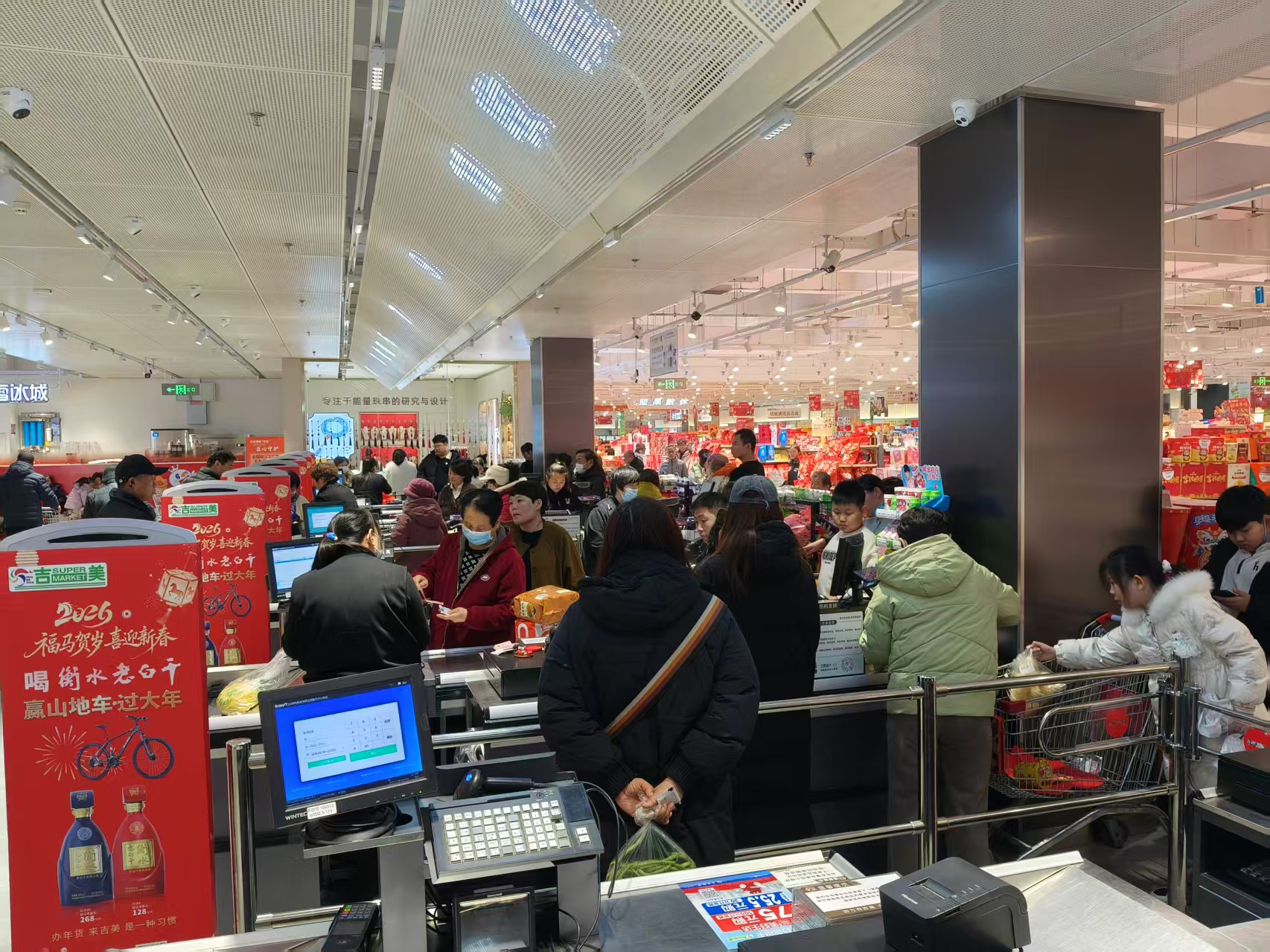 2月8日,记者来到市区中心大街一家大型超市,放眼看去,满目皆是喜庆的“中国红”,火红的灯笼、烫金的福字、各式春联挂件格外显眼,粮油副食、生鲜果蔬、特色礼盒等商品琳琅满目、供应充足。卖场里人声交织,促销员的介绍、顾客的询价、手推车的转动声响成一片,市民们欢欢喜喜购买着心仪的年货。“我们早早启动了春节保供方案,不仅丰富了年货礼盒、糖果零食、酒水饮料等畅销商品的种类,还积极对接本地及周边产地,直采生鲜果蔬,满足大家多样化的采购需求。同时,我们严把质量关口,精准管理库存,实时进行销售检测,确保大家买到新鲜、实惠、安全的年货。”超市相关负责人陈立叶介绍,刚刚过去的这个周末,超市销售量同比增长超过4%。