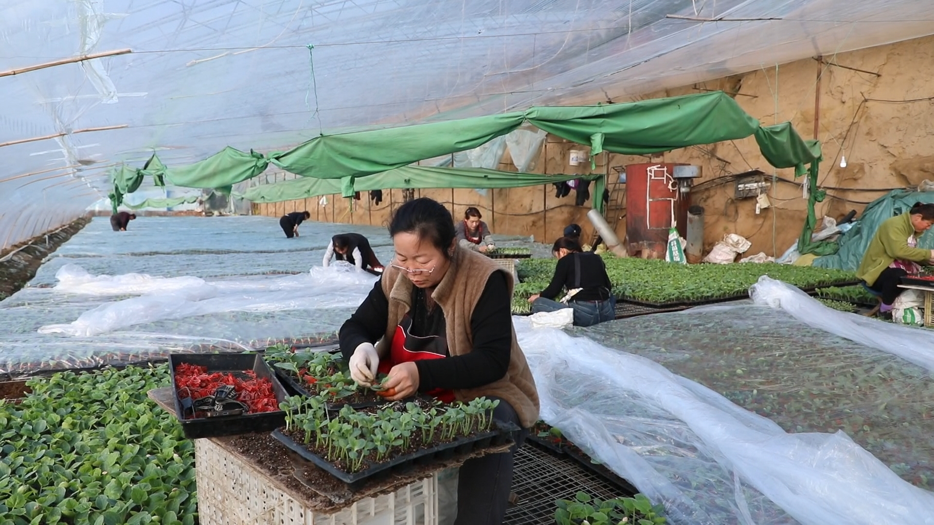 大棚外寒风凛冽,大棚内生机盎然。午后的阳光透过塑料薄膜洒进来,工人们仍在有条不紊地忙碌着。一株株嫁接好的幼苗被小心地放回育苗台,不久后它们将被送往各地的种植基地,在春天里生根发芽,茁壮成长。在这个特殊的时节,育苗大棚不仅承载着农业生产的重要使命,更成为乡村振兴的生动缩影。