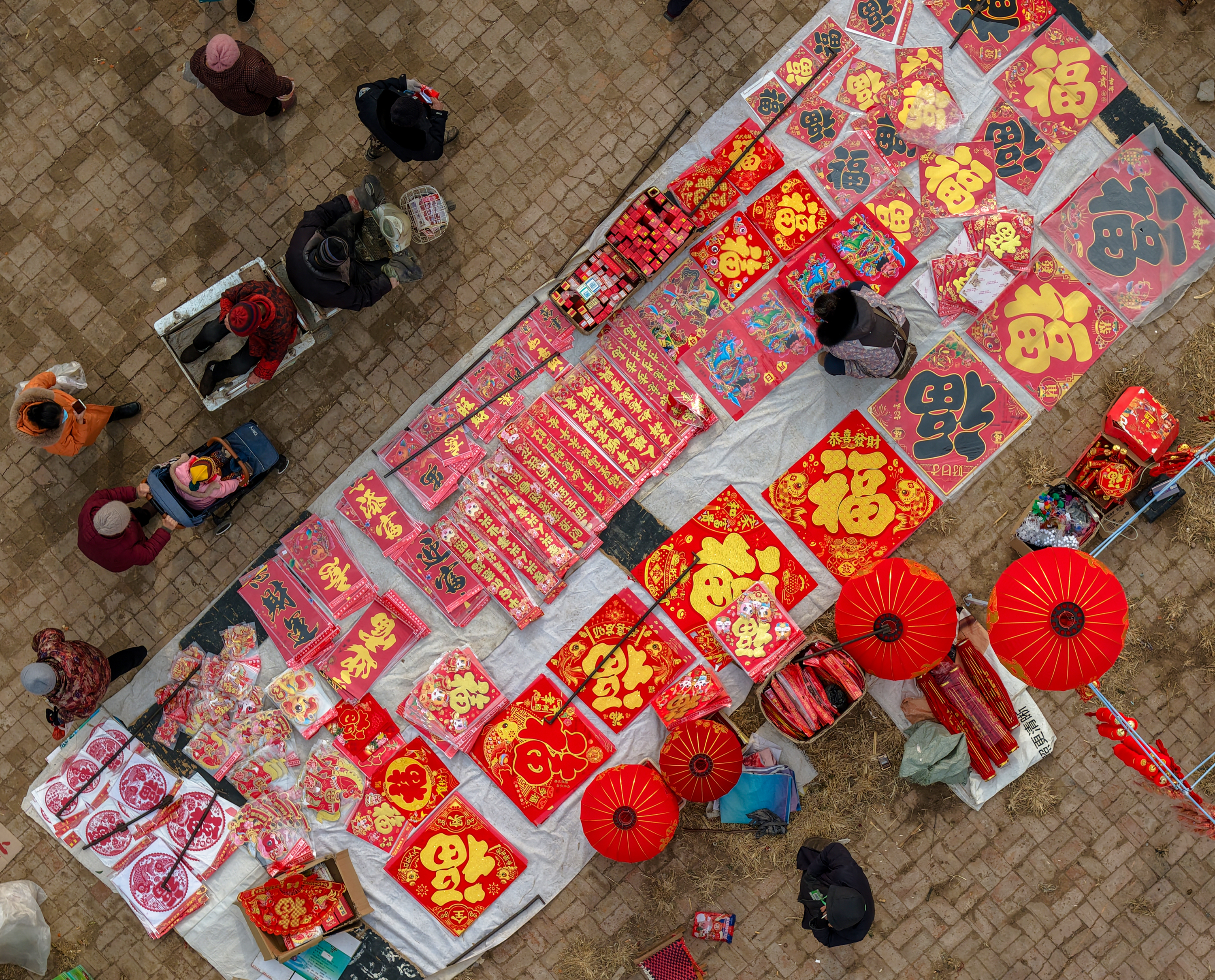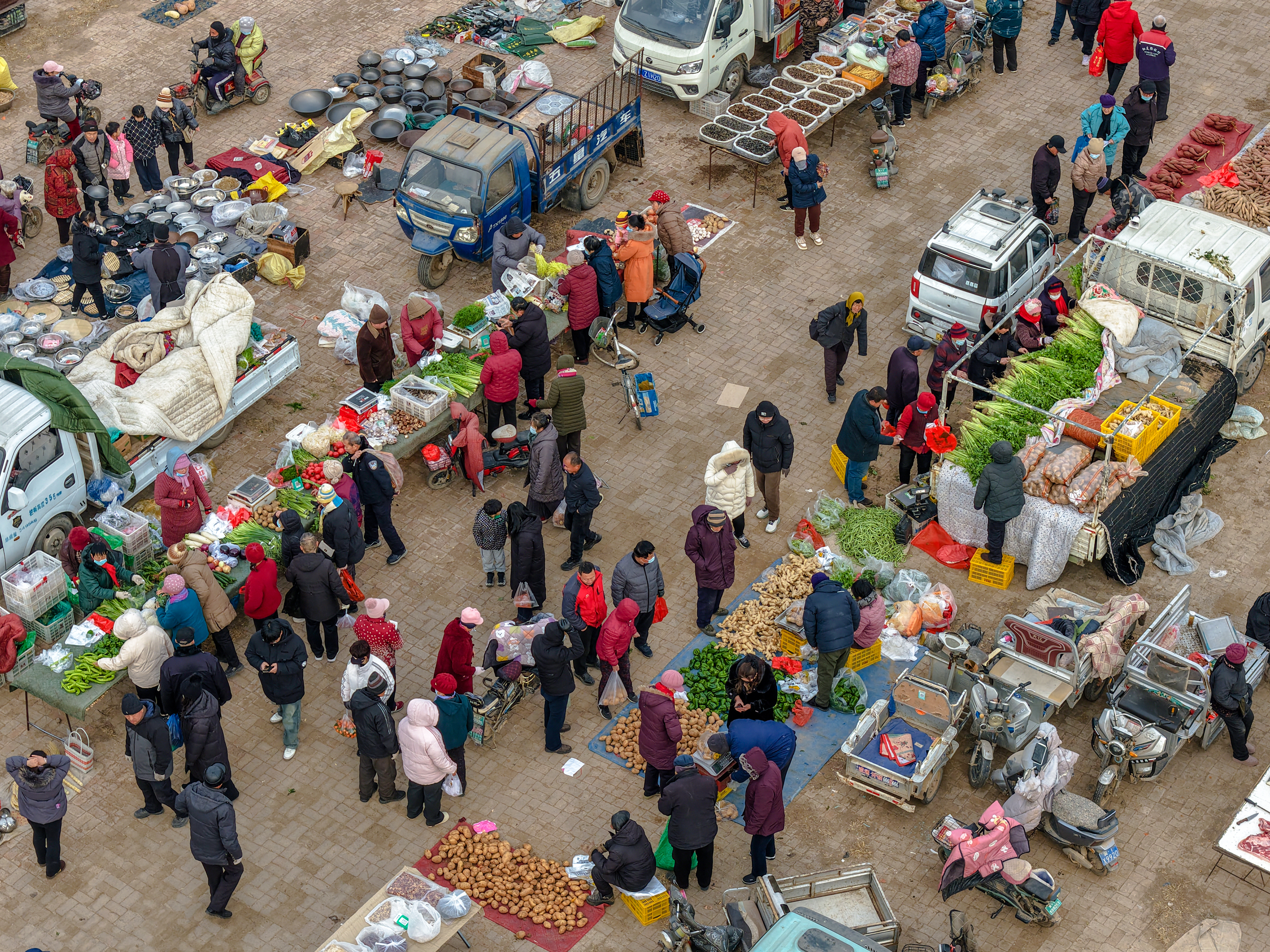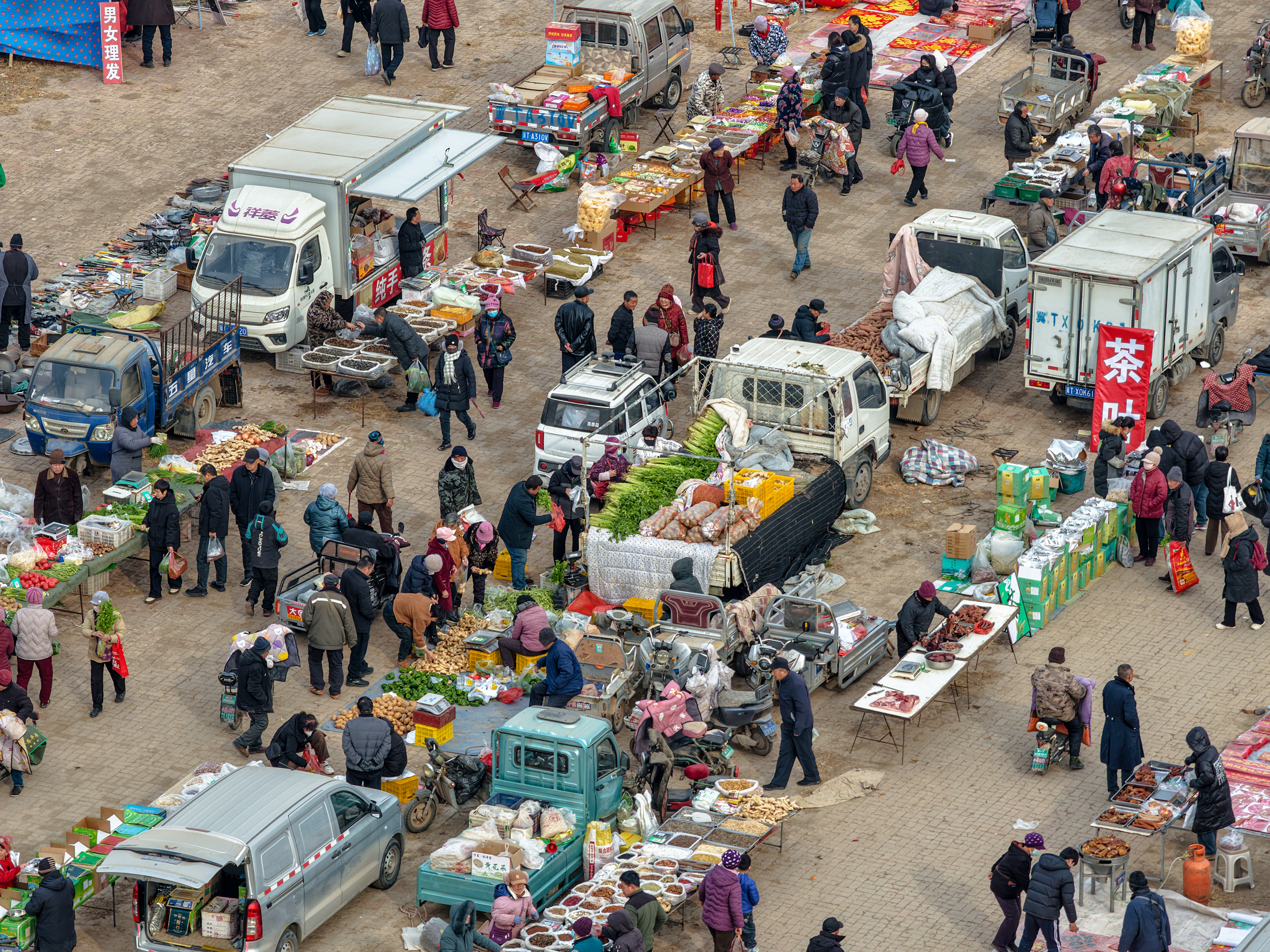 从高空俯瞰,河沿大集人头攒动、车流穿梭,与周边的桥梁、民居相映成趣,构成一幅生动的乡村年货赶集图。