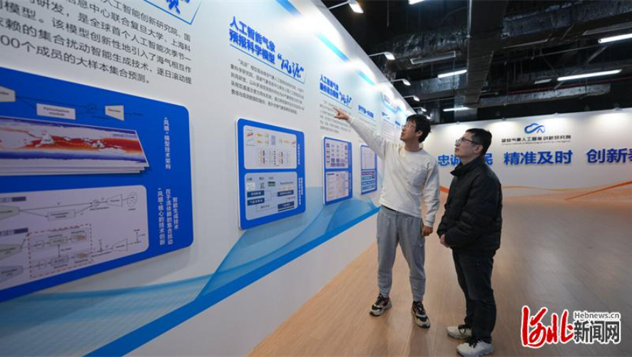 2月6日,在雄安气象人工智能创新研究院展示大厅,窦则胜和工作人员正在探讨人工智能气象预报科学模型“风源”。河北日报见习记者李畅摄