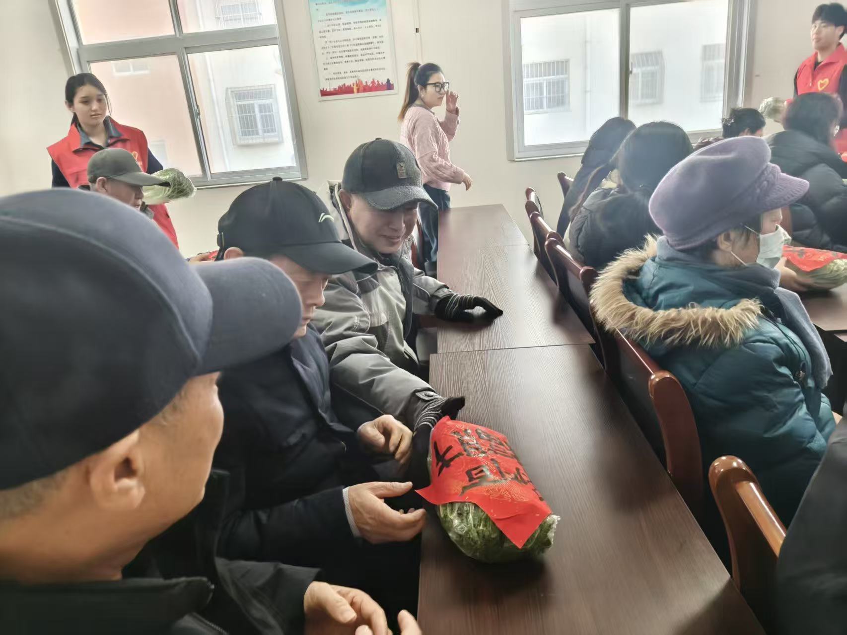 一张张福字被陆续写好、晾干,另一边的志愿者们也开始忙碌起来。大家取来由爱心企业味之道餐厅出资购买的新鲜水灵的大白菜,小心翼翼地把大红福字贴在白菜身上,有的还在福字旁写下“百财聚来”“财源滚滚”的吉祥话,让寓意“百财聚来”的白菜与福气满满的福字相映成趣,一份份独具特色的“纳福福礼”很快整装完毕。