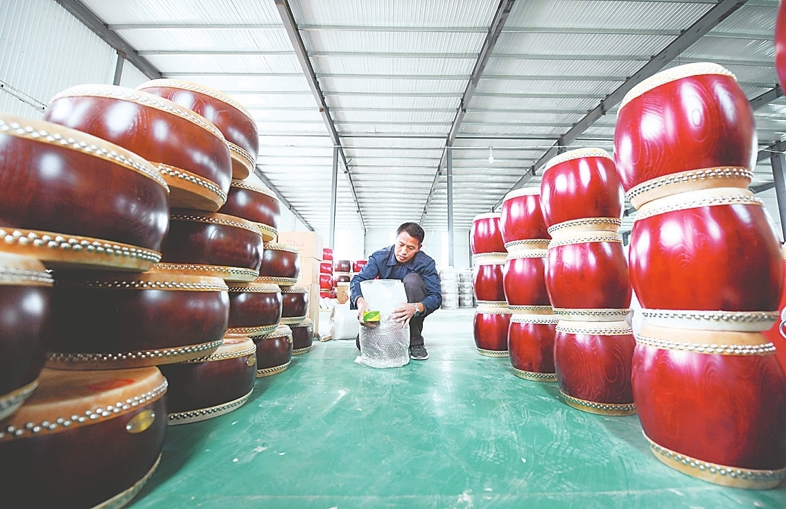 “这些天,工人们加班加点,保质保量,年前这最后一批鼓终于要出库了。”公司董事长焦虎星站在宽敞的车间内,指着错落排列、不见边际的“鼓阵”介绍说,他们生产的中国鼓不仅深受各地民间打鼓爱好者的喜爱,还得到很多顶级专业表演团队的青睐,目前公司订单已经排到年后。