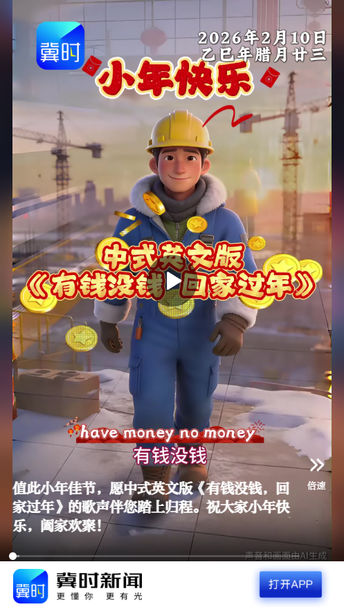 来源:冀时新闻原标题:值此小年佳节,愿中式英文版《有钱没钱,回家过年》的歌声伴您踏上归程。祝大家小年快乐,阖家欢聚!