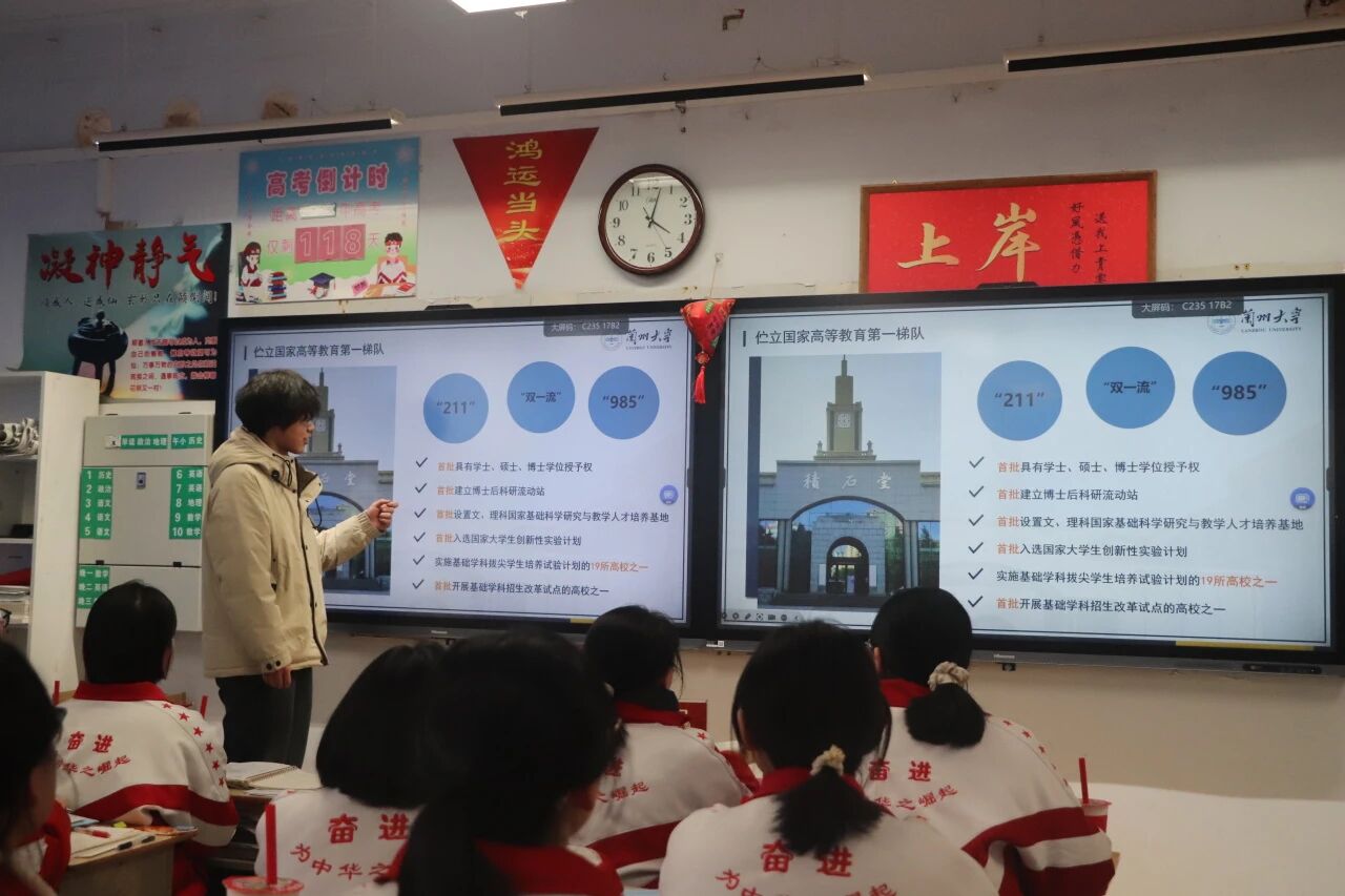 欢迎大会后,校友们进班开展大学宣讲活动,结合自身的大学学习、生活经历,为学弟学妹们的未来规划指引方向。他们怀着感恩之心,与昔日恩师促膝长谈、重温过往,诉说着离开母校后的成长与蜕变。