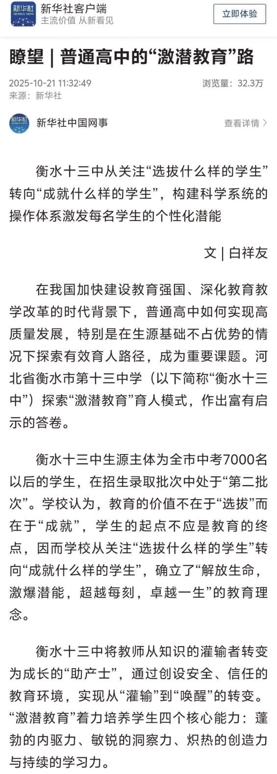 《普通高中的“激潜教育”路》登上新华社主办的《瞭望》新闻周刊。