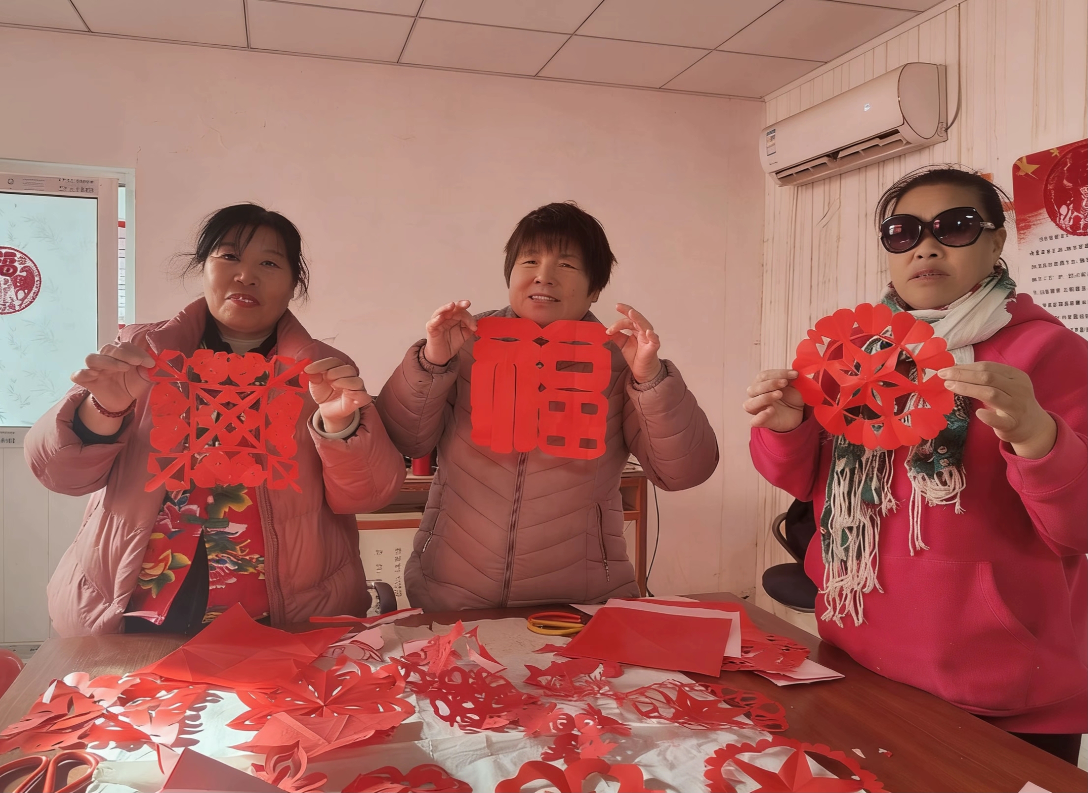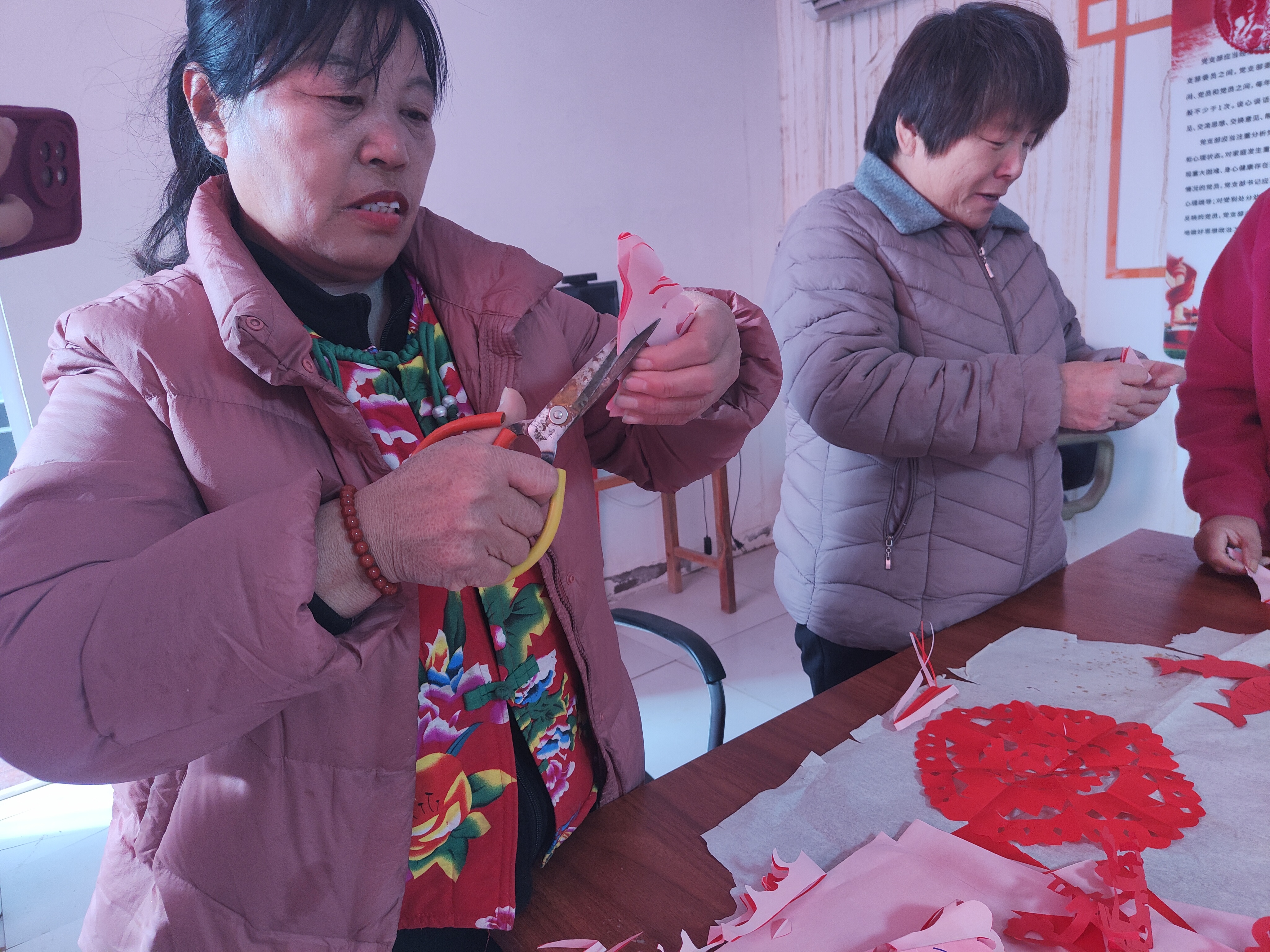 “窗花剪吉庆”环节中,村里的妇女们各显身手,折剪翻转间,红彤彤的“福”字、精美的吉祥窗花相继诞生。“剪窗花是老辈传下来的手艺,现在和姐妹们一起剪,不仅热闹,还剪出了新年新福气。”一位村民手持剪纸笑着说道,窗花与书籍相映,勾勒出温馨的乡村文化图景。