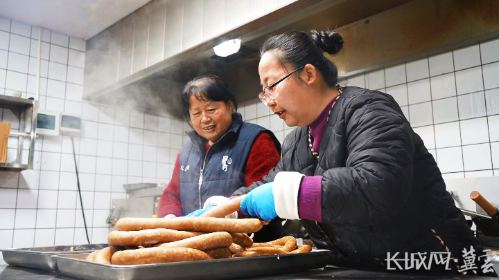 民宿工作人员正在制作香肠。长城网·冀云客户端 祁鑫 摄