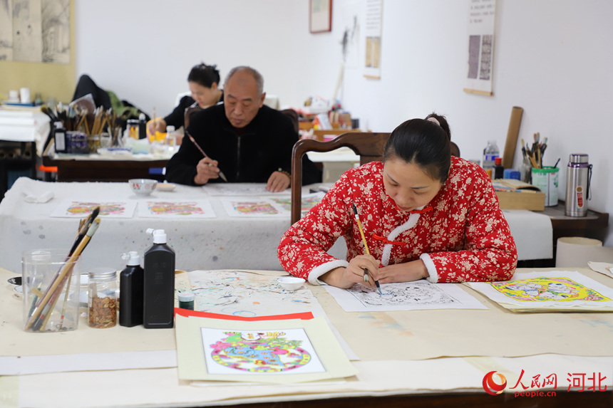 河北衡水武强县汇名轩木版年画非遗工坊内,年画艺人们正在对年画作品润色。人民网记者 商帆摄
