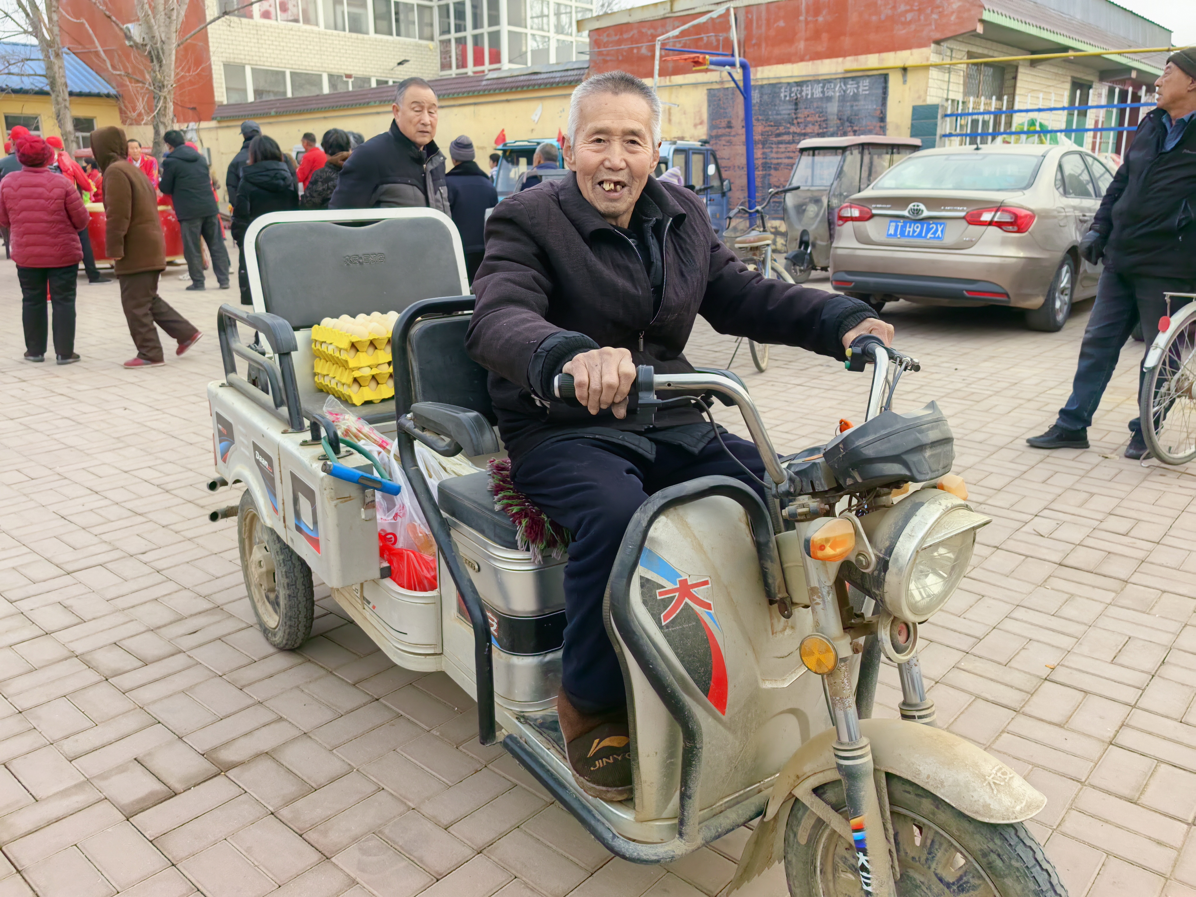 “咚咚锵、咚咚锵”“咱村80岁以上的老人和60岁以上的老党员,抓紧来村委会领福利啦!”“你们也来啦?闺女小子回来了吗?”……喧天的锣鼓声、发通知的大喇叭声和村民们的对话声交织,年味儿顺着一辆辆三轮车蔓延到了街头巷尾。