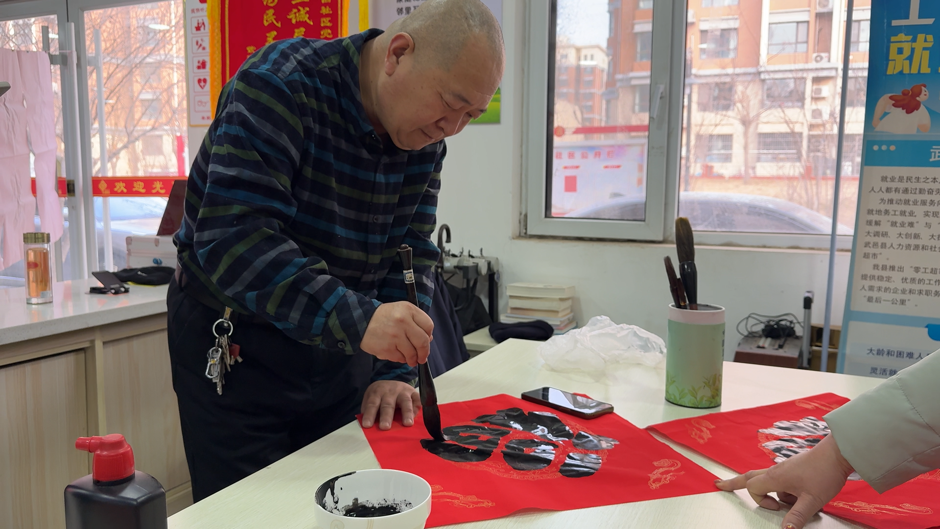“孙老师,再帮我家写个带‘马’字的春联吧!”书法区前,挤满了等候的居民。书法家孙保国、杜金凯被围在人群中,却不急不躁。铺纸、蘸墨、落笔,一气呵成——一个个饱满的“福”字、一副副对仗工整的春联应笔而生。居民张大爷捧着刚写好的春联端详良久,笑着说:“手写的春联才叫过年,墨香就是年味。”