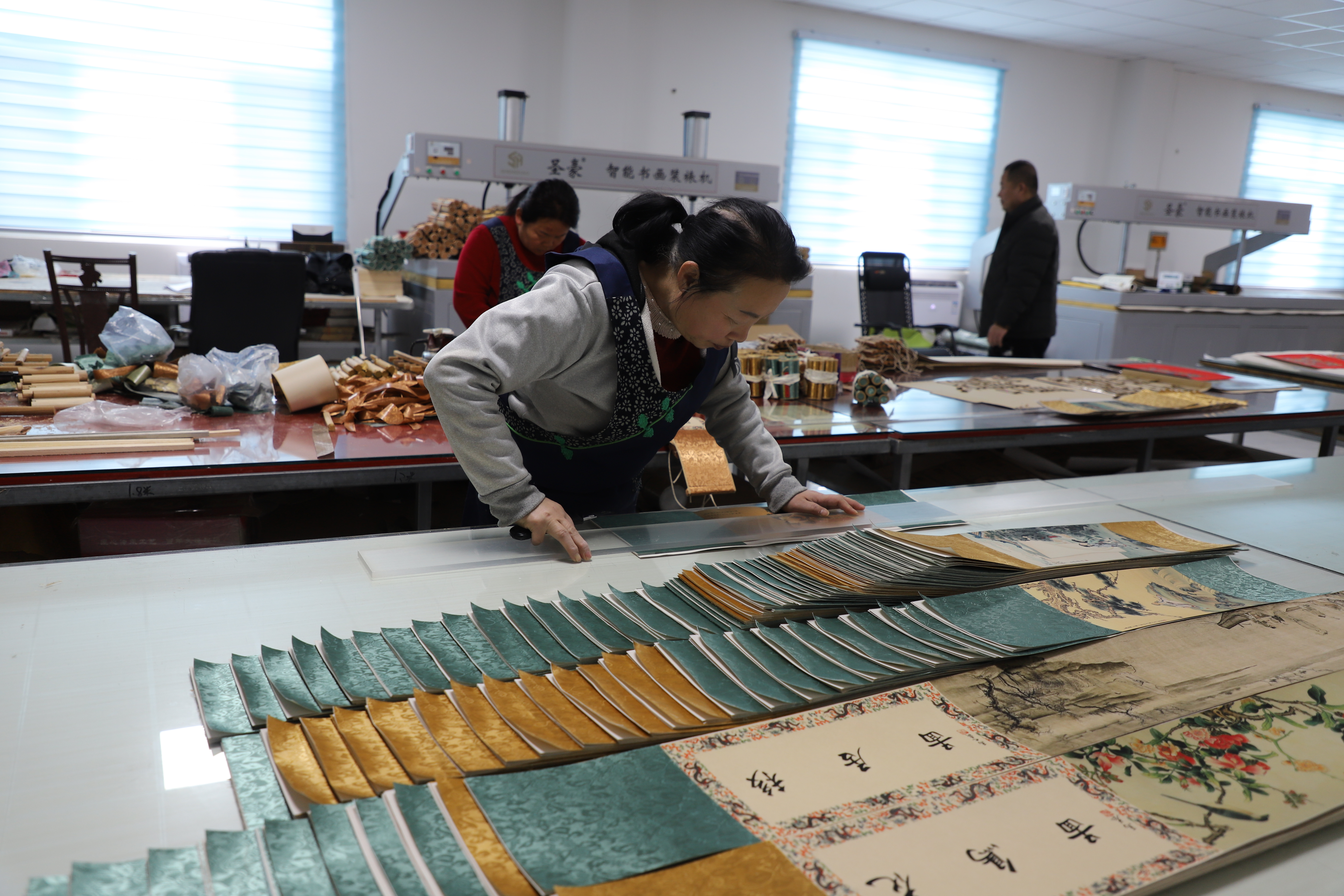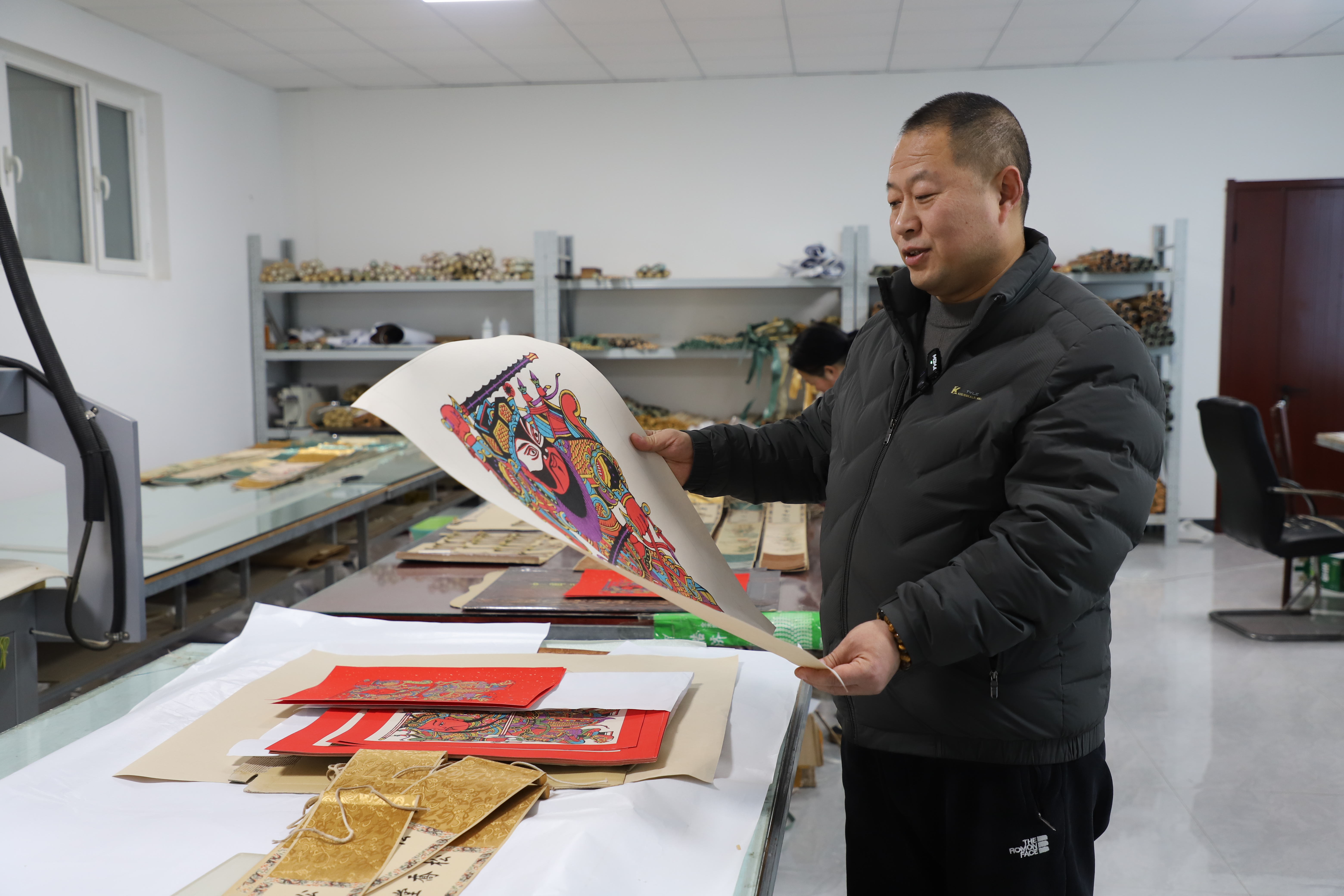 武强县汇名轩木版年画非遗工坊里,1000多幅年画和小幅传统国卷轴订单正在赶制中。负责人温潜麟和工人们穿梭于各个车间,加紧拓印、装裱。在《花开富贵》等经典题材年画旁,也出现了融合西方审美的新样式。温潜麟提醒工人,“线条要柔和,色彩再淡雅一些,更贴合老外的喜好。”