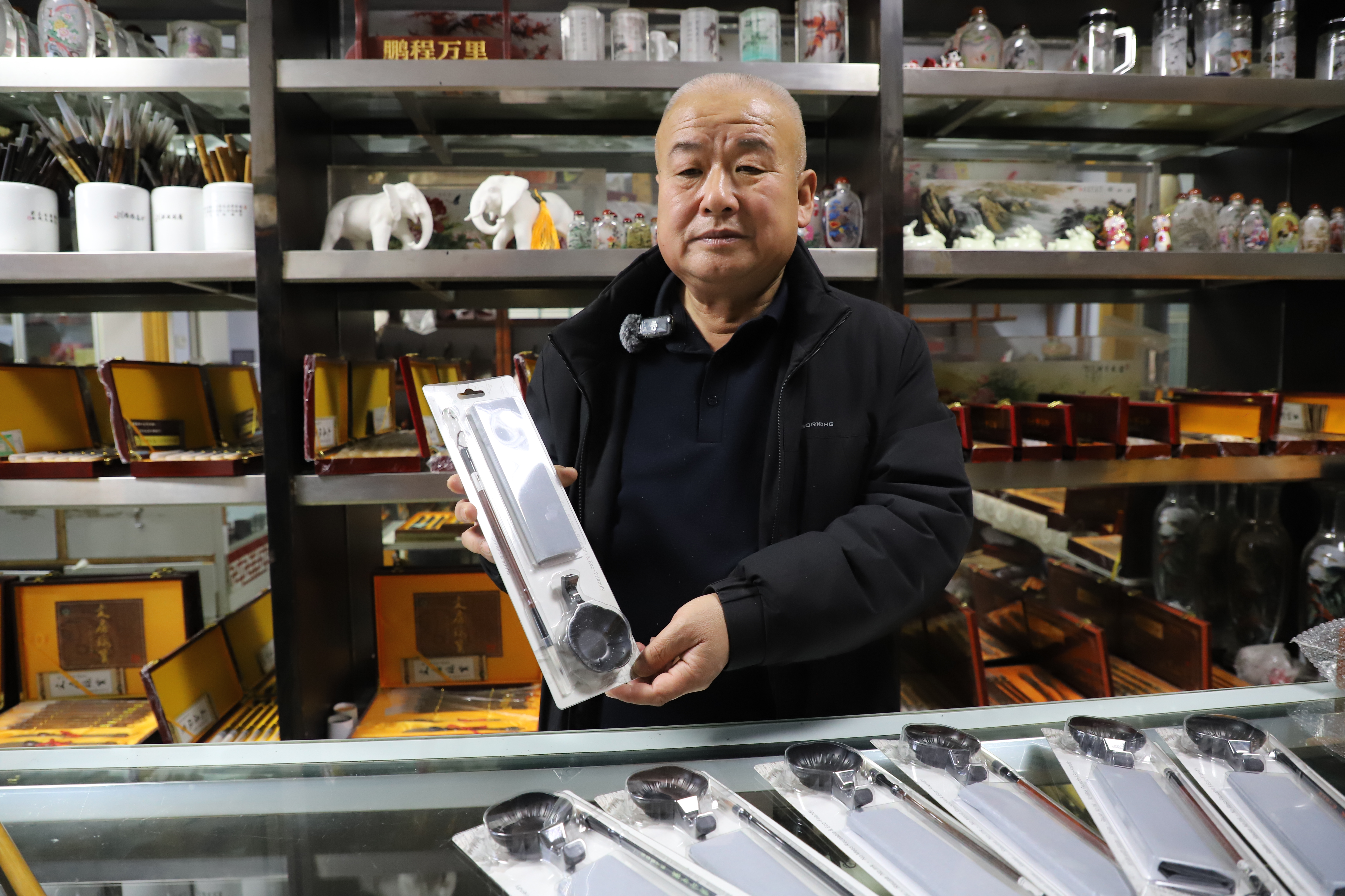 在孙占彪毛笔厂里,3000套量身订做的海外毛笔套装已经完工。孙占彪对这些套装格外满意:“这款毛笔套装,笔杆设计更符合欧洲人的握笔习惯,还附有水写布、水碟和意、英两种语言说明书,让外国人也能轻松体验中国书法!”