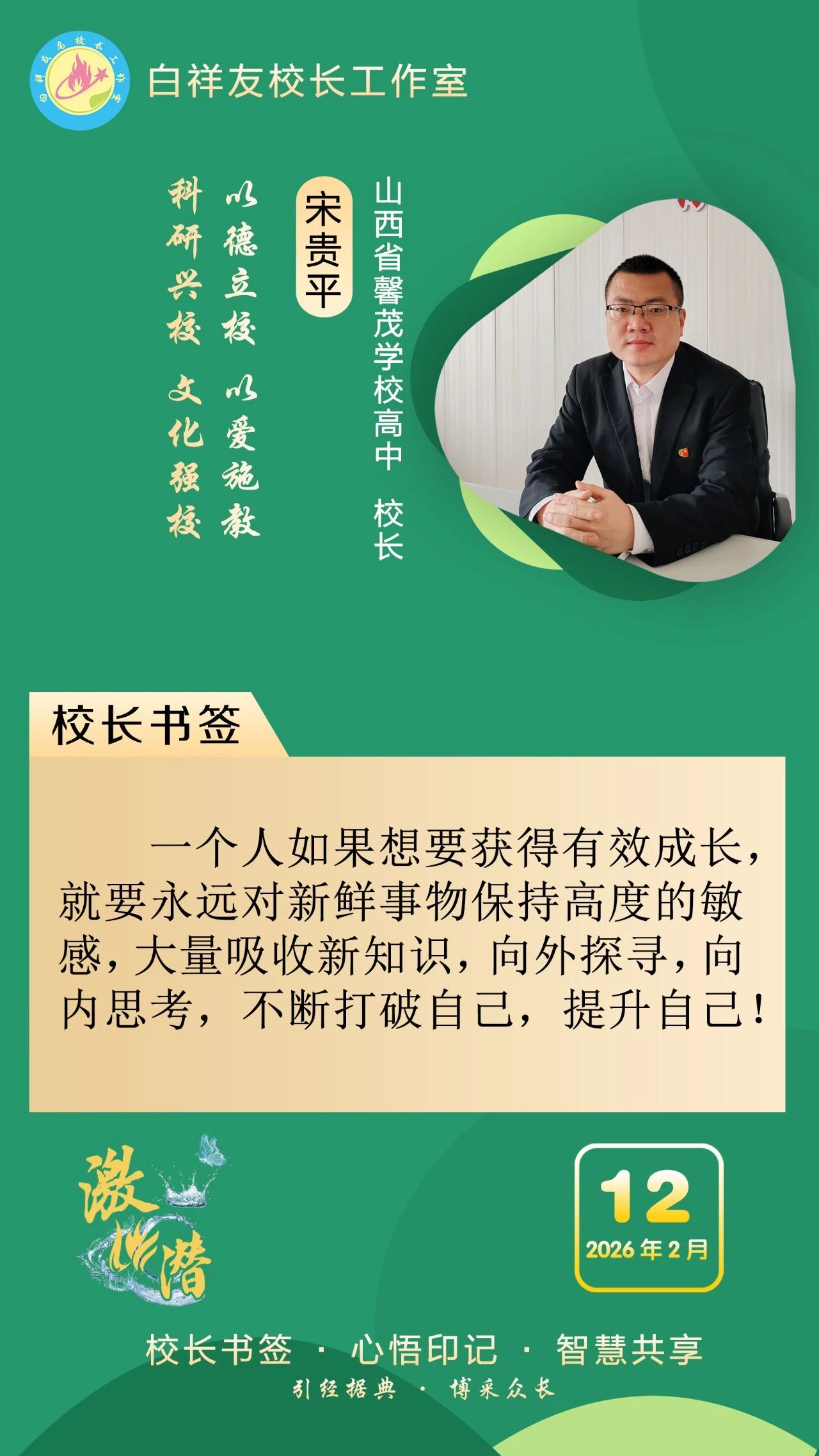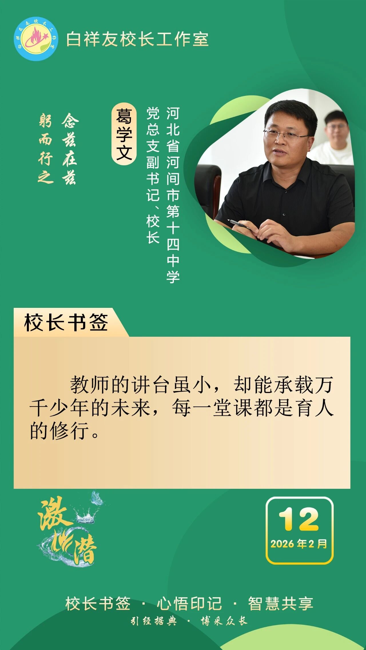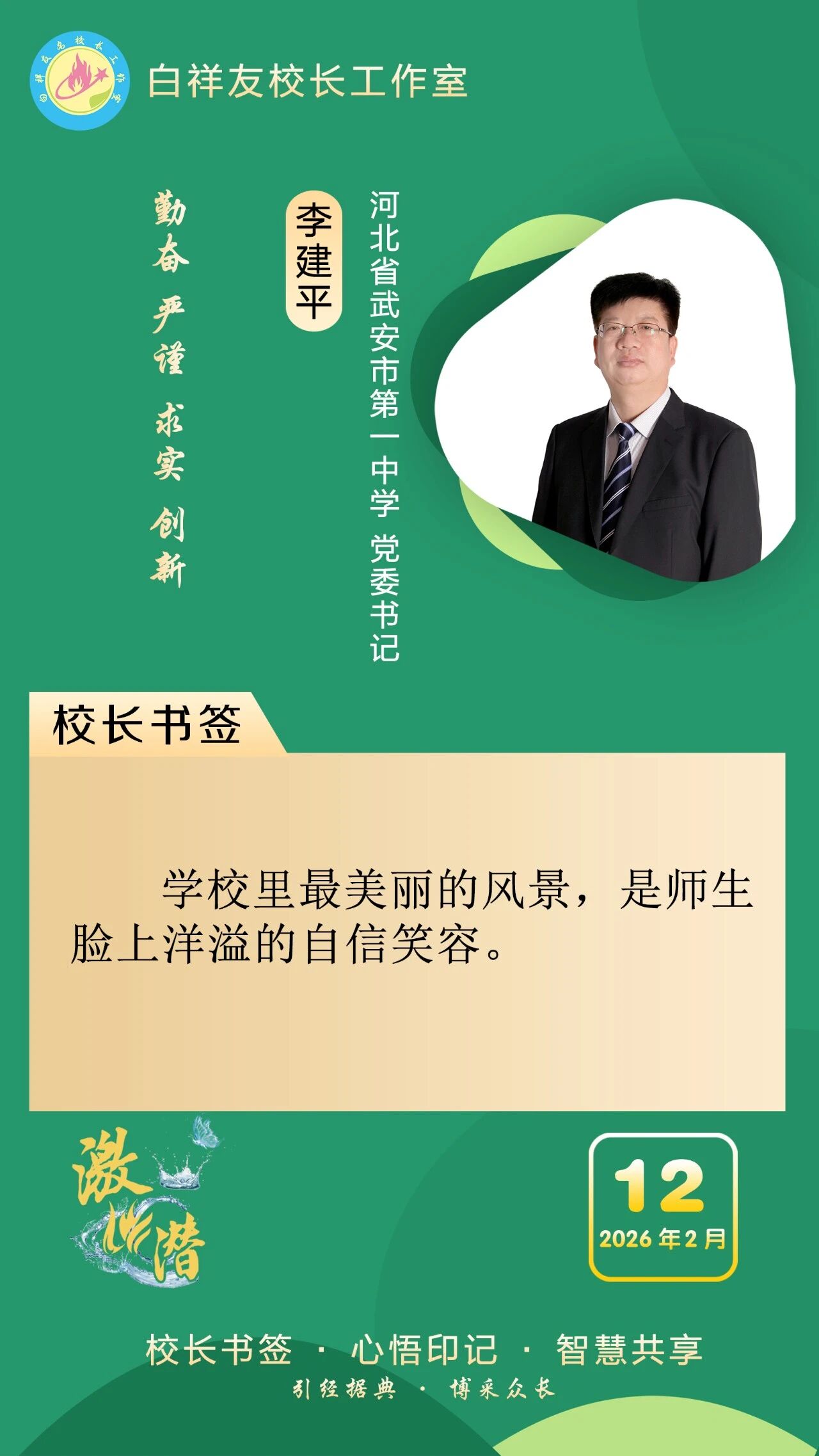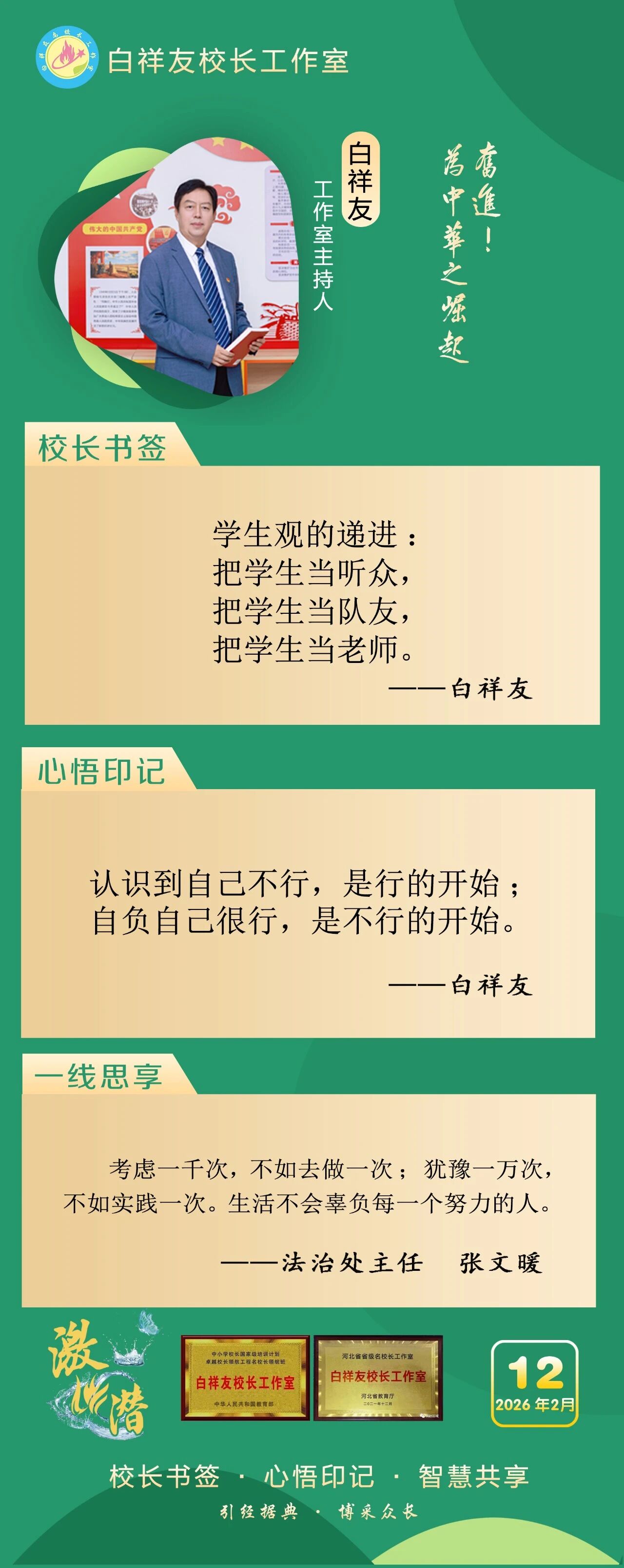 “白祥友校长工作室”成立于2019年4月,是教育部“国培计划”中小学名校长领航工程、河北省首批名校长工作室,目前省内外成员校59所。工作室坚持“资源共享、智慧共融、互助共赢”理念,已成为思想碰撞的交流场,资源共享的品牌站,成果展示的辐射源。 点赞 +1 微博 微信 我要评论 发布 相关推荐 白祥友校长工作室成员新疆实验中学冯永庄校长一行来衡水十三中参观交流 教育大观 03-23 衡水市名校长大讲堂在衡水十三中举办 教育部中小学校长培训办公室于维涛主任作专场报告 教育大观 01-19 白祥友校长工作室成员带队参观衡水十三中 教育大观 2024-05-22 “白祥友校长工作室”成员校石家庄十五中百余教师来衡水十三中参观 教育大观 2024-04-01 热门 一天 三天 一周 1 【乡村行 看振兴】花海连片溢芬芳 春日邂逅好风光——衡水国际设施园艺产业园油菜花开见闻 2 【“十五五”开局看衡水】 当乡土好物遇上“数字春风”——武邑县“一品一播”激活特色产业新动能 3 清明祭英烈 薪火永相传——武邑职教中心师生赴任角“五二一”烈士陵园开展祭扫活动 4 雄商高铁河北段全线送电 5 衡水滨湖新区数据和政务服务局成功办结首例个人独资企业转型升级业务 6 武邑:缅怀先烈寄哀思 青春接力传薪火 7 武邑:以网红经济赋能县域经济发展 8 衡水市持续推进文化遗产保护传承 9 缅怀革命先烈 传承红色基因|武邑宏达实验学校师生赴“五二一烈士陵园”开展清明祭扫活动 10 “全国个体网大讲堂”走进武强 赋能个体工商户 1 五大调整 衡水2026年消费品以旧换新政策有新变化 2 一场仪式 一堂党课 一次洗礼 武邑县举行清明节祭扫活动 3 衡水90余家外贸企业赴阿里巴巴跨境电商基地“充电” 4 衡水杨柳絮预报地图出炉 5 春风送岗 戎耀湖城 衡水市举办2026年退役军人军属春季专场招聘会 6 衡水市桃城区聚焦“四大领域”优化营商环境 7 全球首次 12只自然繁育野化青头潜鸭在衡水湖放飞 8 衡水市桃城区中华大街街道衡丰社区开展风筝制作主题活动 9 【衡视频】15万公斤西红柿滞销 枣强种植户急盼销路 10 【褒扬诚信典型】衡水大学生拾金不昧 捡到万元手机物归原主 1 源清流清 向上向善 2 【新闻发布】衡水市发布2026年消费品以旧换新政策 持续释放消费潜力 3 【“十五五”开局看衡水】破局引领破圈 共享实现共赢 ——探访河北冀尚医疗器械有限公司智能化共享喷涂车间 4 河北衡水:雄商高铁衡水南站建设进行中 5 人勤春光好 沃野绘“丰”景 ——衡水市各地抢抓农时做好春耕春管 6 河北衡水:春染衡水湖 游人乐享生态好风光 7 指尖织就锦绣 匠心守护非遗 ——记衡水地毯传统编织技艺非遗传承人陈兵 8 守护外卖安全 衡水发布七条网络餐饮食安倡议 9 去年京津冀技术合同成交额1.4万亿元 10 金融镜鉴|因不按约定赔付等原因,阳光财险多家分支机构合计被罚超百万 广告 广告 广告 24小时 1 海报系列||早安衡水 2 缅怀革命先烈 传承红色基因 衡水市清明祭英烈主题系列活动正式启动 3 以信寄情 以行致敬 阜城县漫河镇开展清明祭扫主题实践活动 4 阜城县纪委监委 开展“缅怀革命先烈 筑牢廉政初心”活动 5 全国推广!枣强县无障碍建设经验入选国家首批可复制经验做法清单 6 衡水交通执法多举措保障清明假期出行安全 7 衡水市“春风行动”收官 1.7万余人次初步达成就业意向 8 冀州区滏阳社区开展清明节系列主题活动 9 铭记英烈功勋 凝聚奋进力量 衡水市开展培育和践行社会主义核心价值观活动 10 故城县开展清明缅怀英烈系列活动