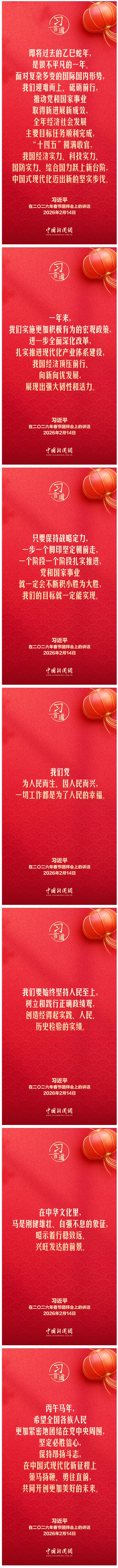 2月14日,中共中央、国务院在人民大会堂举行2026年春节团拜会。中共中央总书记、国家主席、中央军委主席习近平发表讲话,代表党中央和国务院,向全国各族人民,向香港特别行政区同胞、澳门特别行政区同胞、台湾同胞和海外侨胞拜年。他指出——