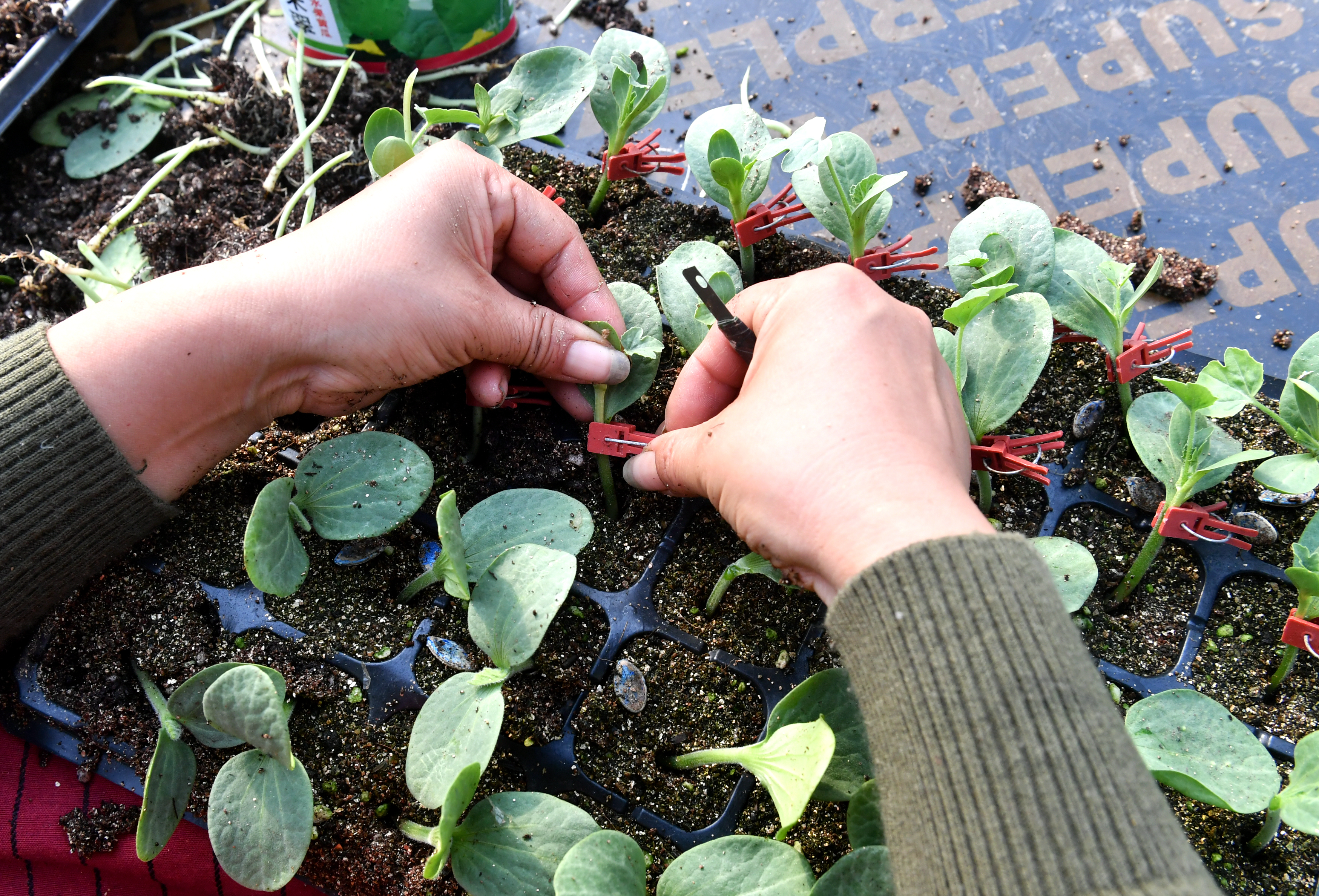 茶话会结束后,记者跟着村民们来到智能育苗大棚,只见一排排育苗台上,绿油油的瓜苗长势喜人,村民们正手法娴熟地进行嫁接作业——拿起小刀在南瓜苗上精准斜切一刀,随后将西瓜苗稳稳固定在南瓜苗上,一套动作行云流水,一株株嫁接好的瓜苗很快便整齐排列开来。