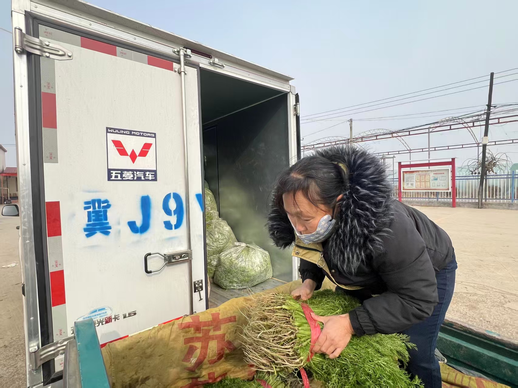 在大尹村镇的春光葡萄专业合作社交易市场,农户们拉着在葡萄大棚里套种的茴香、香菜、生菜等匆忙赶来,外地客商的冷链货车早已在此待命。一箱箱绿叶菜被有序搬上车,即将发往各地商超与农贸市场。