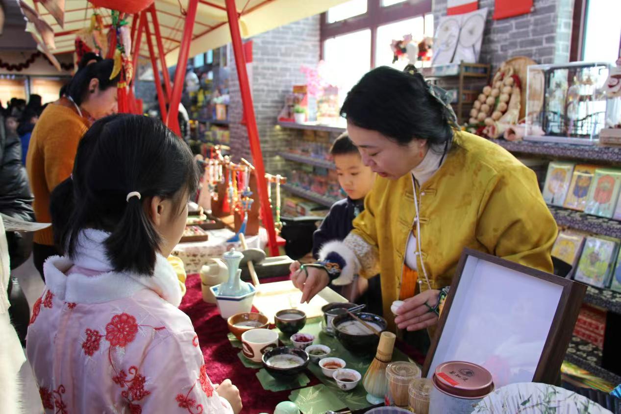 最热闹的还属互动体验区。年画拓印台前,孩子们在老师指导下,手握刷子轻轻滚压,一幅幅寓意吉祥的年画跃然纸上,墨香伴着笑声飘散开来。陶艺区里,泥土在手中慢慢成形,孩子们捏出的小碗、小动物虽然稚拙,却满是新年的心意。仿宋点茶体验区,几位年轻人正认真学着茶艺师的动作,点茶、击拂、品茗,仿佛穿越时空,感受千年前的传统技艺之美。