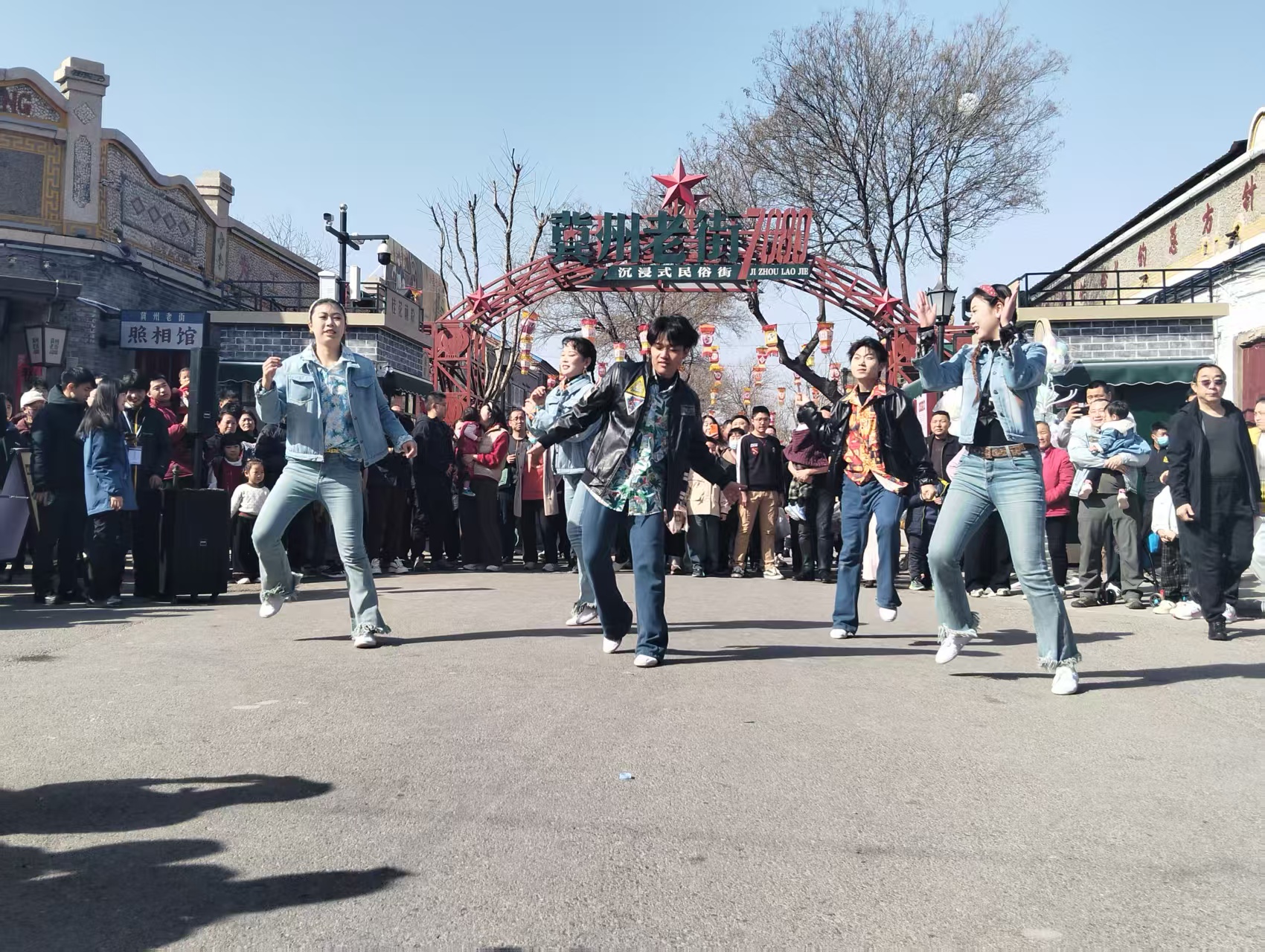2月20日,正月初四,正午时分,在衡水市冀州区冀州老街,大一男生步绍易和伙伴们的迪斯科舞蹈表演不断赢得游客叫好。