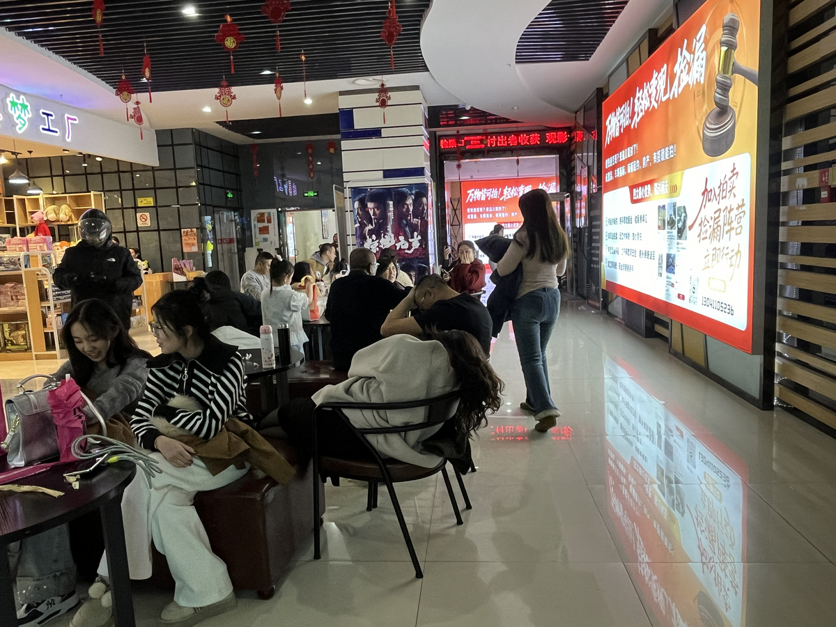 2月21日下午5点,尚峰广场中影百誉影城前来观影的市民坐满了休息区。影城一进门处摆放着一个熊出没玩偶,影城还张贴着《飞驰人生3》《惊蛰无声》《星河入梦》等新片海报,整个影城都是马年元素的装饰,不少市民拿着电影票在影城拍照留念。