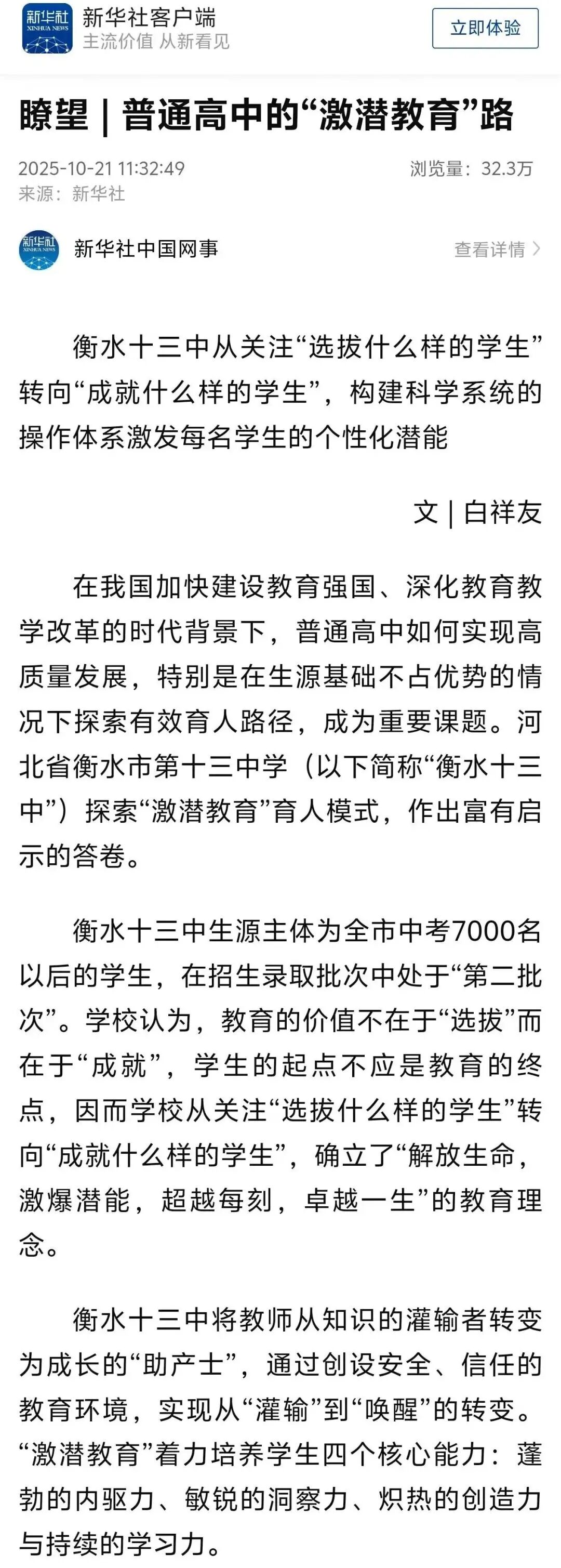 《普通高中“激潜教育”路》一文获新华社主办的核心新闻周刊《瞭望》刊发,新华社客户端同步发布。这一刻,来自衡水湖畔的教育探索,成为全国同行瞩目的改革样本。