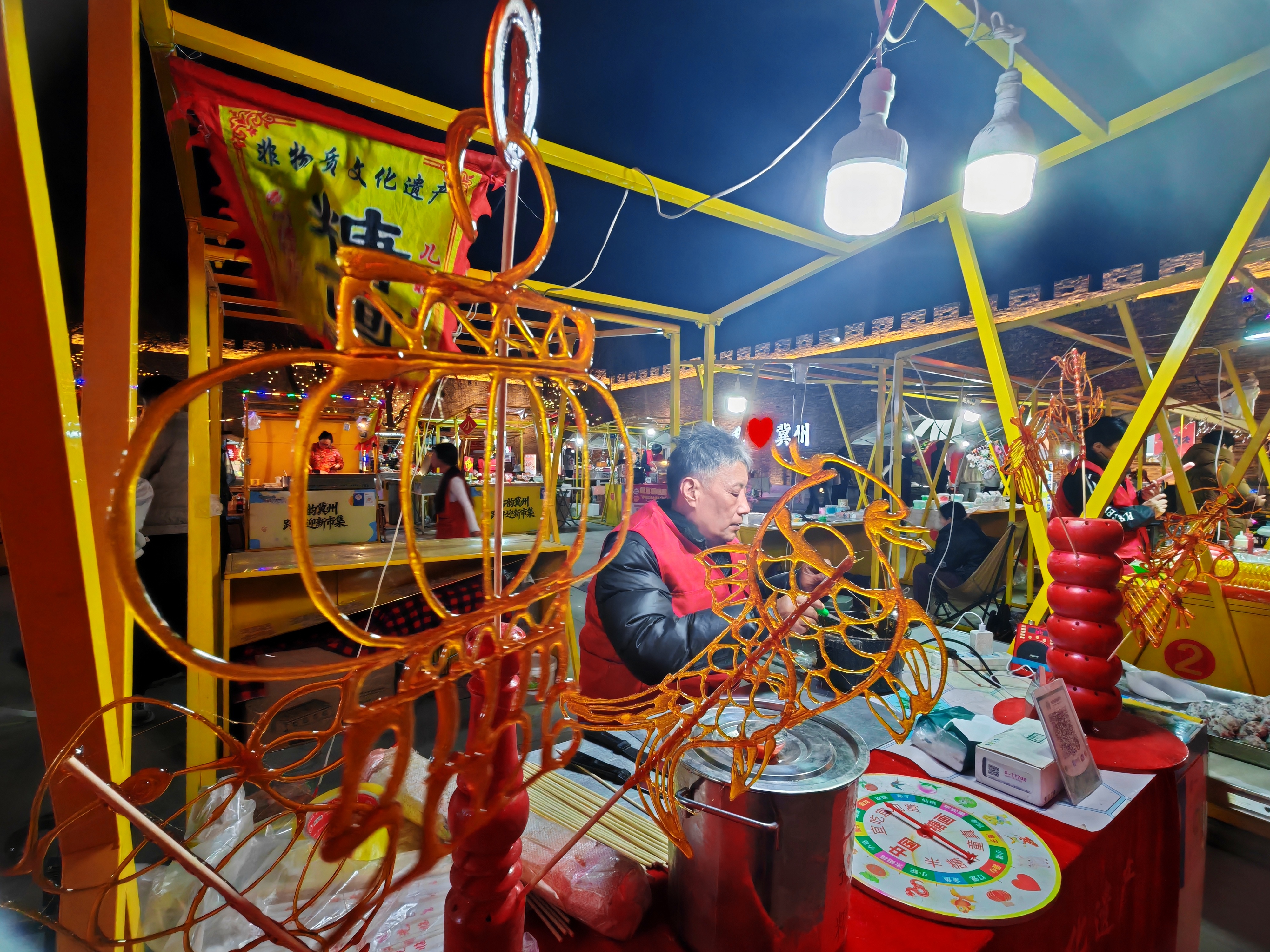 春节期间,冀州市集热闹开市,成为市民感受传统年味儿的好去处。市集融合民俗表演与节庆美食,精彩纷呈。非遗打铁花在夜空中璀璨绽放;糖画、冰糖葫芦等传统小吃香气四溢,摊位前人头攒动。璀璨花灯与铁花交织,营造出“火树银花不夜天”的梦幻场景,让市民在烟火气中尽享新春欢乐。