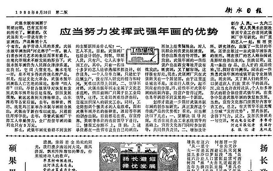 武强年画,作为中国农耕文明的图像记忆,以其浓郁的乡土气息、质朴的艺术风格和吉祥寓意,深受群众喜爱。近代以来,武强年画历经战乱动荡,一度式微,后经系统性抢救、整理与研究,这颗民间艺术明珠重焕生机。《衡水日报》的2000余篇相关报道,记录下武强年画在一代代人的守护中重生,又在时代的浪潮中主动求变的过程。如今的武强年画,正从传统年货演变为珍贵的文化遗产、独特的艺术藏品和富有魅力的文化IP。