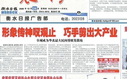 创新也让衡水剪纸的市场边界不断拓宽,从低端民俗剪纸升级为装饰画、文创礼品、旅游纪念品等多元化文化商品,静电吸附、镜框装裱、书画挂轴等各类款式应有尽有,成为市场新宠。2011年11月25日《衡水日报·晨刊》B1版提及,阜城剪纸已成功走进企业文化市场,2006年为蒙牛集团制作剪纸订单作为顾客礼品,西安杨森、中国联通等企业也通过剪纸展现企业文化;2013年2月23日B1版报道,阜城剪纸通过艺术展、进课堂、网上订单等形式,走向全国乃至海外市场,走出一条广阔的文化产业发展之路。