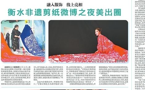 衡水剪纸更是以跨界融合之姿走出国门,成为中华优秀传统文化对外传播的桥梁。2024年12月17日《衡水日报·晨刊》B1版报道,一位博主一袭红色剪纸服装现身意大利米兰街头,外国友人纷纷驻足拍照,相关视频全网走红;2025年1月16日B1版报道,微博之夜红毯上,演员曾黎身着7米非遗剪纸长裙惊艳全场。这些“吸睛之作”,皆出自衡水剪纸艺术家李娜之手。李娜秉承“剪纸是行走的动态艺术”理念,让剪纸从静态纸面变为动态服饰艺术。她的话,道出新时代非遗传承的真谛:“传承不是必须学会这门手艺,欣赏并传播,本身就是一种传承。”
