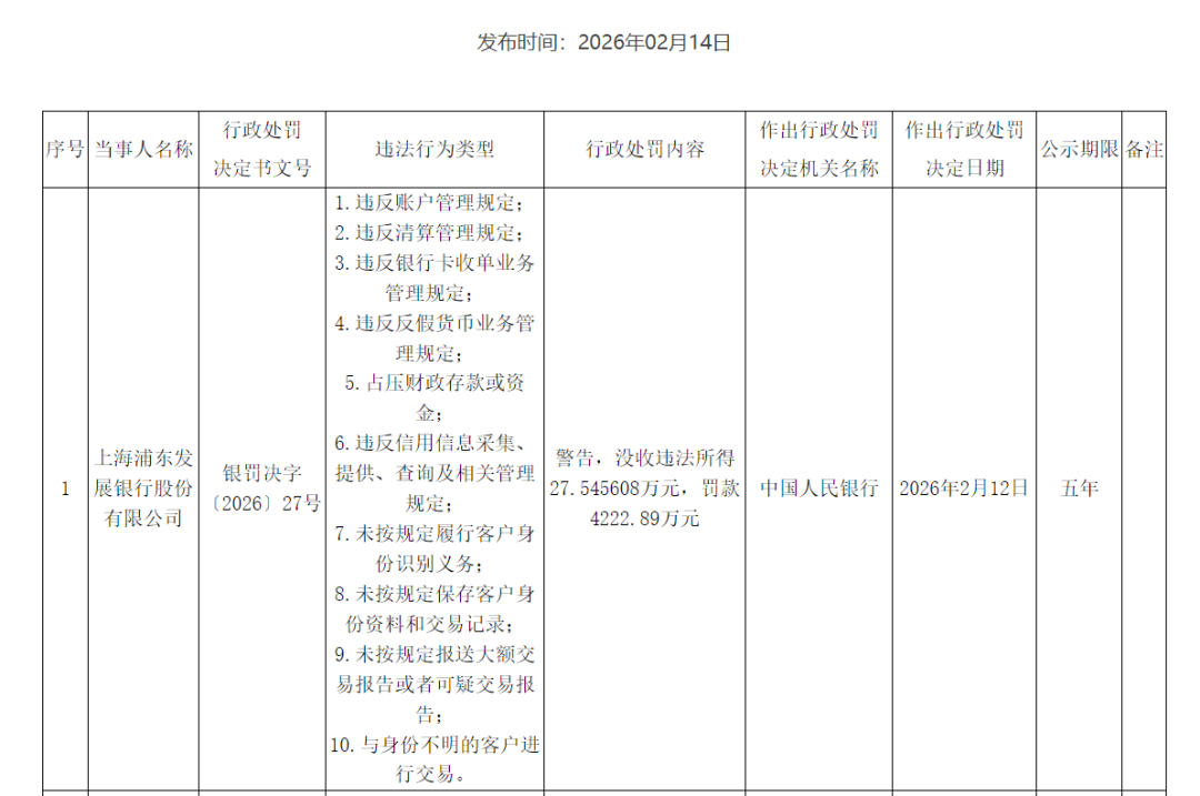 据悉,浦发银行此次收到的行政处罚决定书文号为银罚决字〔2026〕27号,违法违规行为多达10项,涵盖账户管理、清算结算、银行卡收单、反假货币、财政资金管理、征信管理、反洗钱等多个核心领域,几乎触及银行业合规经营的所有关键底线,与此前交行等银行被罚的高频违规点高度重合,凸显出部分银行在核心业务合规管控上的共性短板。