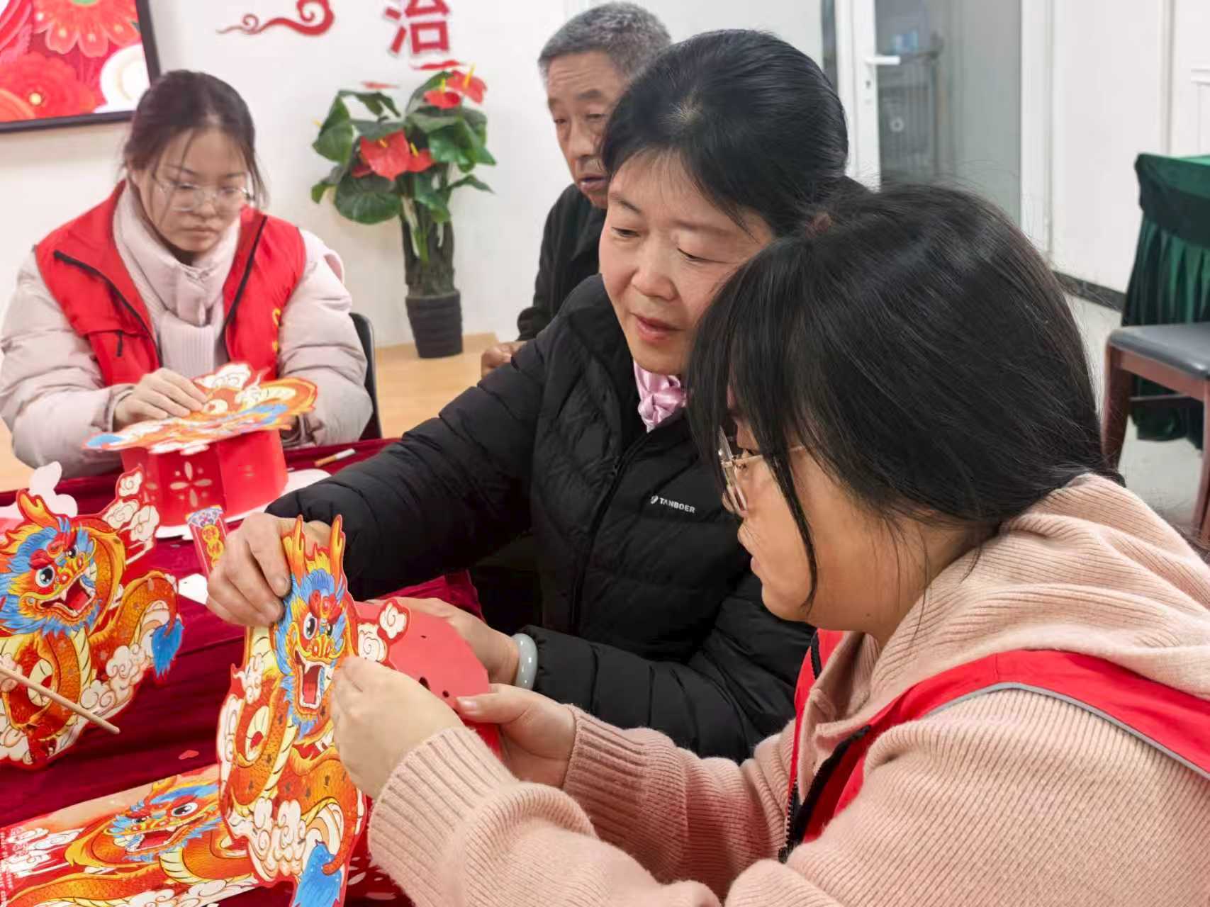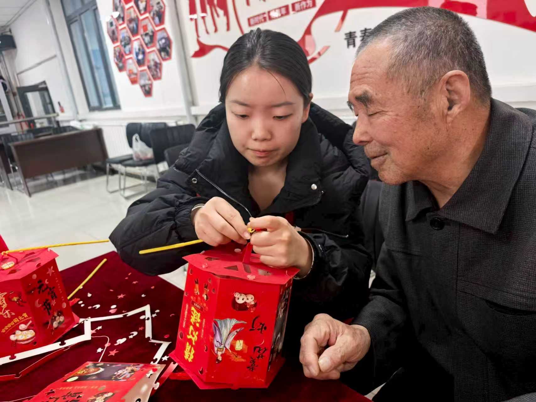 活动现场,志愿者们提前准备了彩色卡纸、竹篾、LED灯等材料。折叠、粘贴、穿线,孩子们认真动手,老人们细心制作,老少搭档分工合作,志愿者们在旁协助,大家发挥创意、互相帮助、欢声笑语不断。不一会儿,一盏盏形态各异的花灯在巧手中诞生。有寓意吉祥的“锦鲤灯”、俏皮可爱的“兔子灯”,还有可以摆尾的“龙灯”。