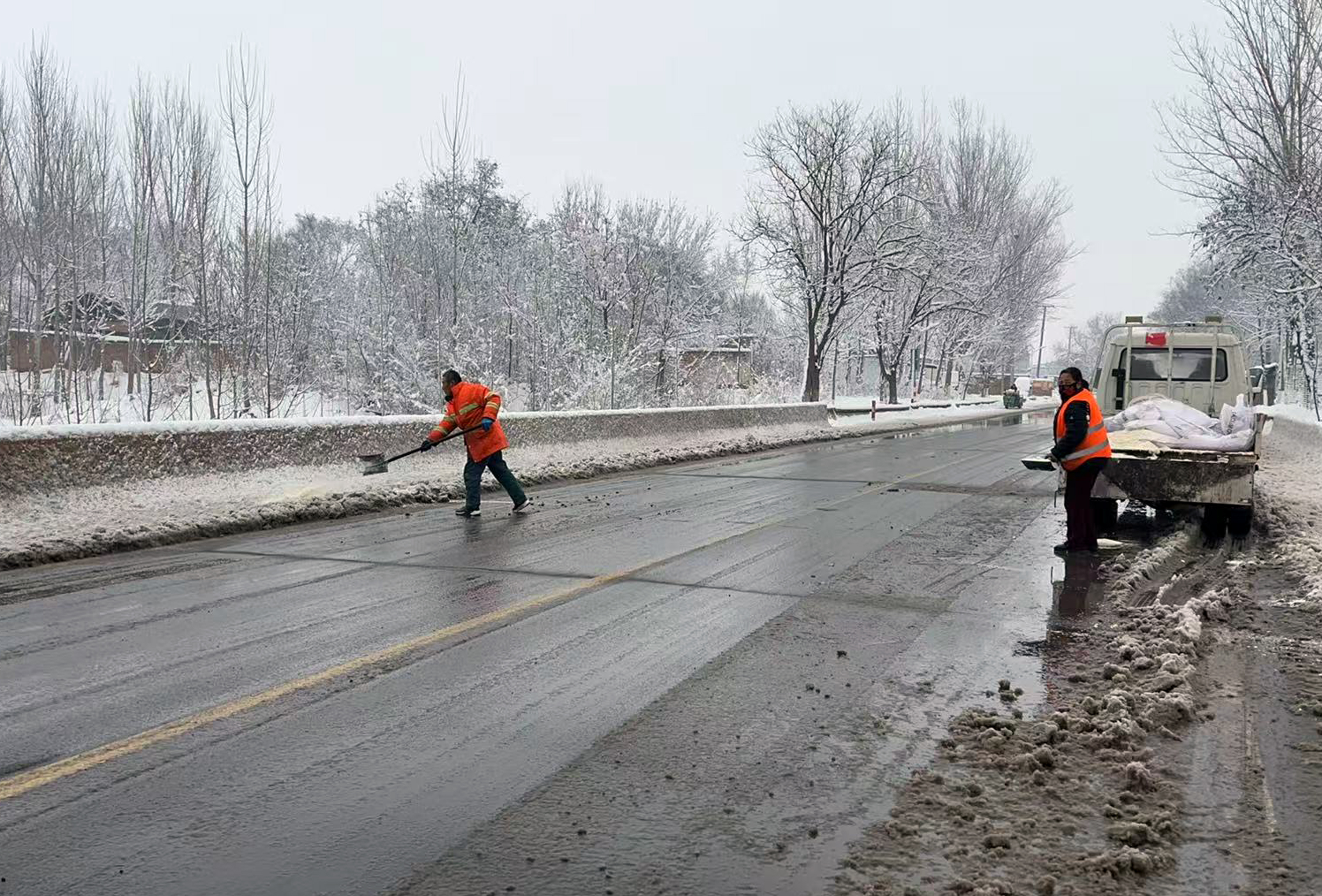当晚22时许,全体清雪人员迅速奔赴一线,投入雪铲、铲车、撒布车等作业车辆14台,采取“机械为主、人工为辅、循环作业”的方式,对国道106、滨榆线,省道040线、衡德线、衡井线、武馆路、宁武路等7条国省干线,以及武小路、审小路、审桑路、朱圈路等重点县乡道路开展不间断清雪除冰作业。同时,对邯港高速武邑两个出入口、桥梁坡道、交叉路口、急弯路段等关键点位实行专人值守、重点清理,确保道路安全隐患及时消除。