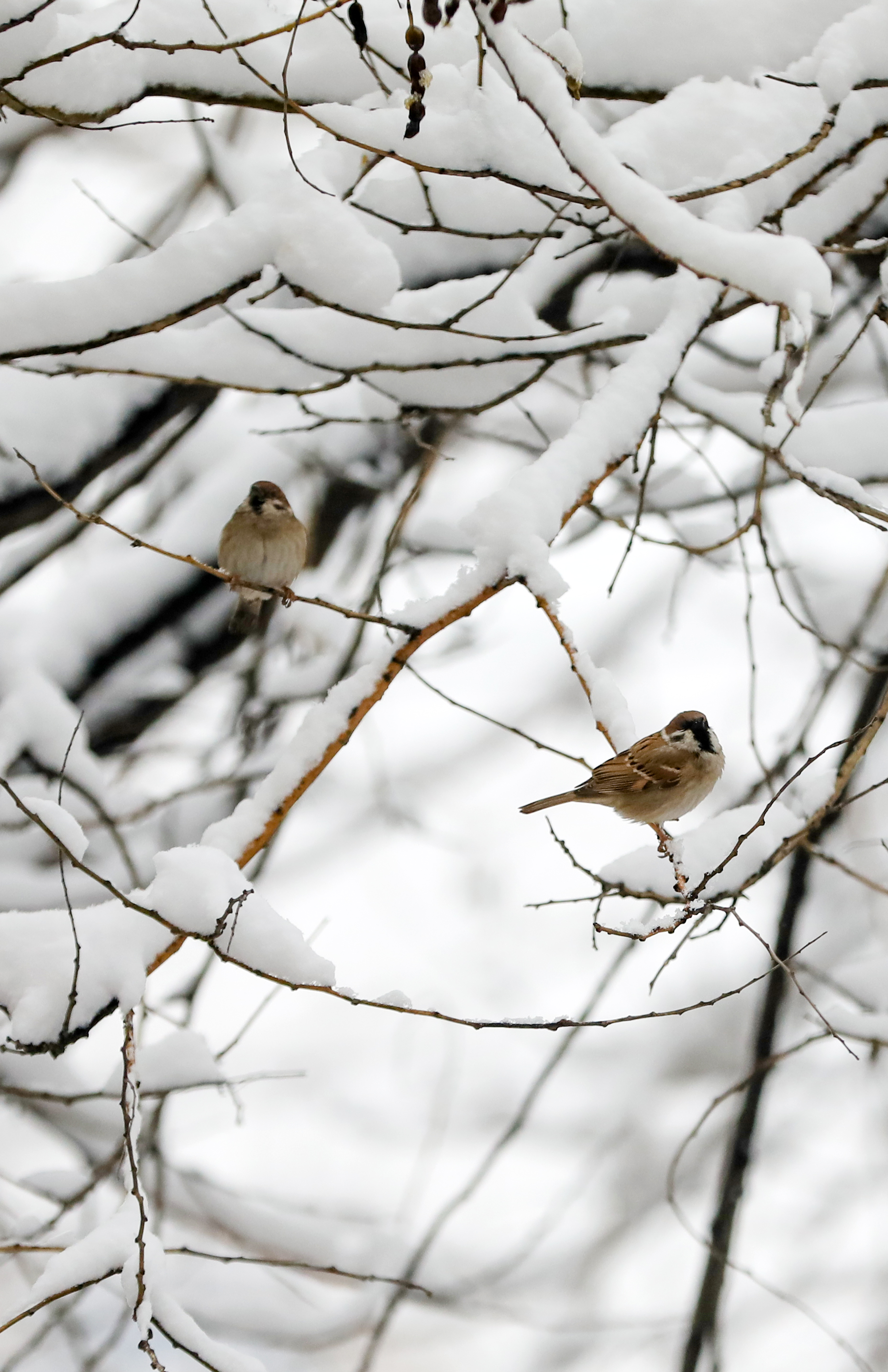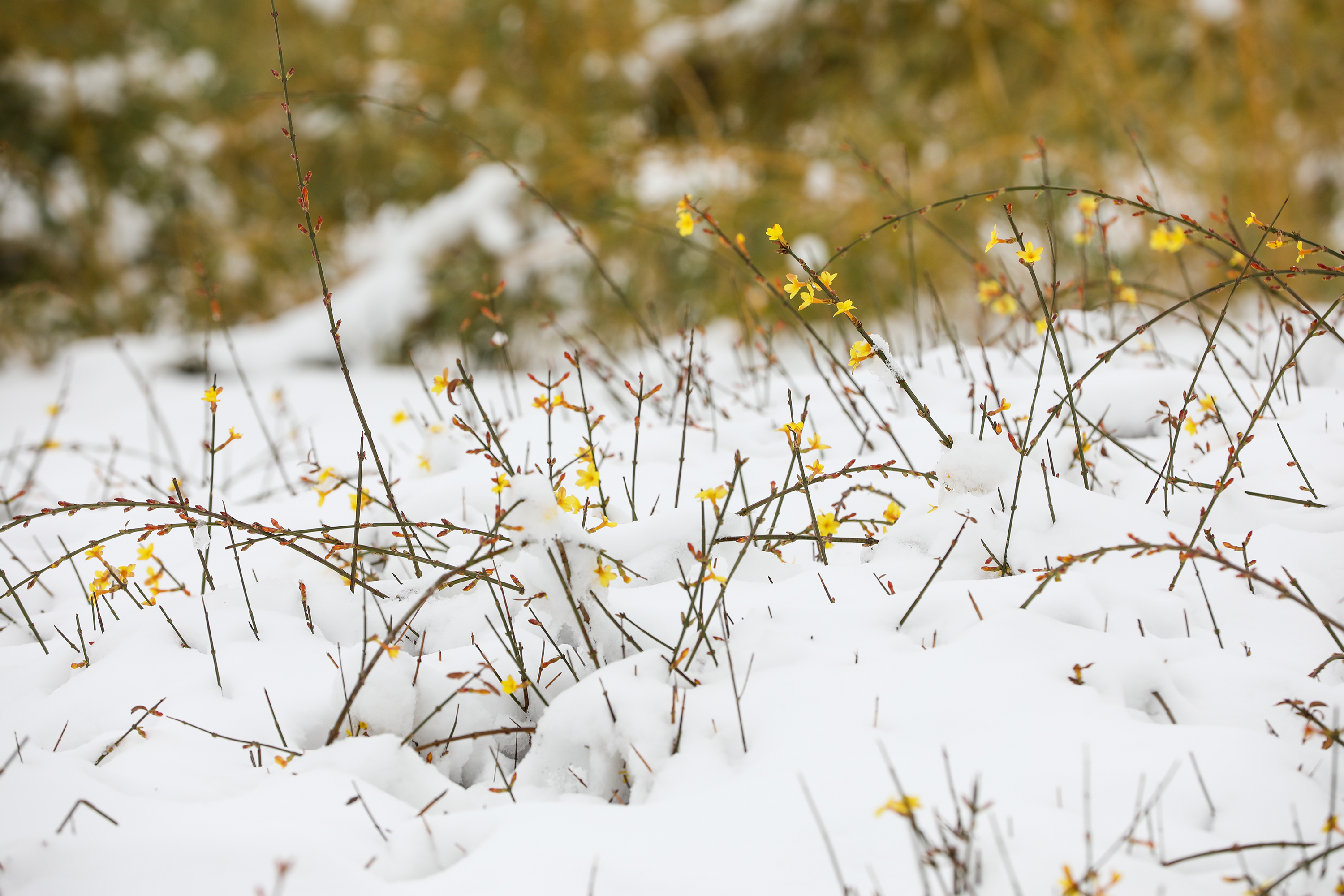 雪后初霁,宝云塔被白雪覆盖,挺拔的塔身在雪雾映衬下更显庄重,与远处的城市楼宇构成一幅独具韵味的冬日图景。枝头积雪蓬松,麻雀在雪枝间穿梭嬉戏,为静谧的园区增添了生机;雪地间,迎春花缀满枝头,嫩黄的花朵与白雪相映,成为冬日里亮眼的风景。