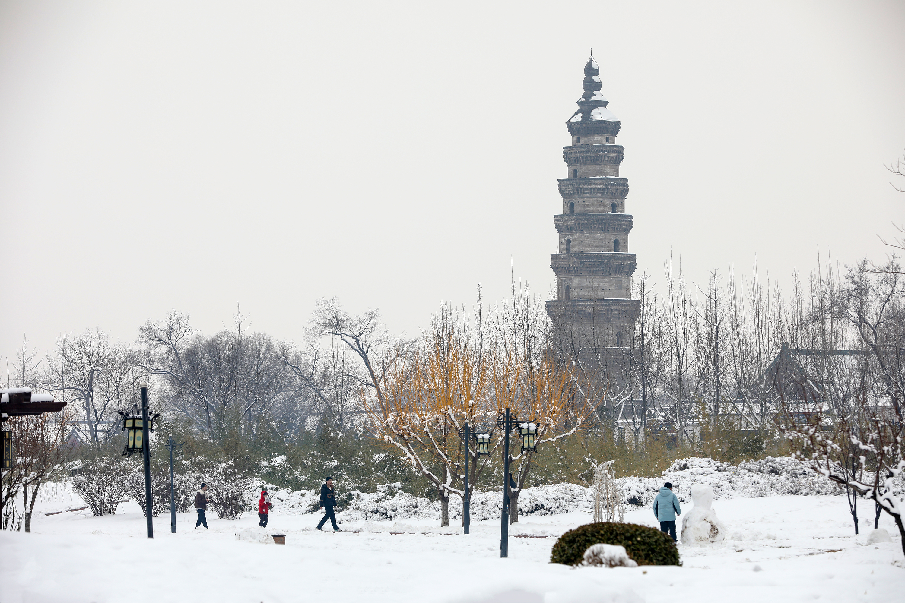 清晨起,市民们纷纷走进公园,尽享雪后乐趣。家长带着孩子堆雪人、打雪仗,欢声笑语此起彼伏;有市民骑行在雪后步道,感受冬日运动的畅快;摄影爱好者则举着相机,聚焦宝云塔雪景,定格这份冬日美好。