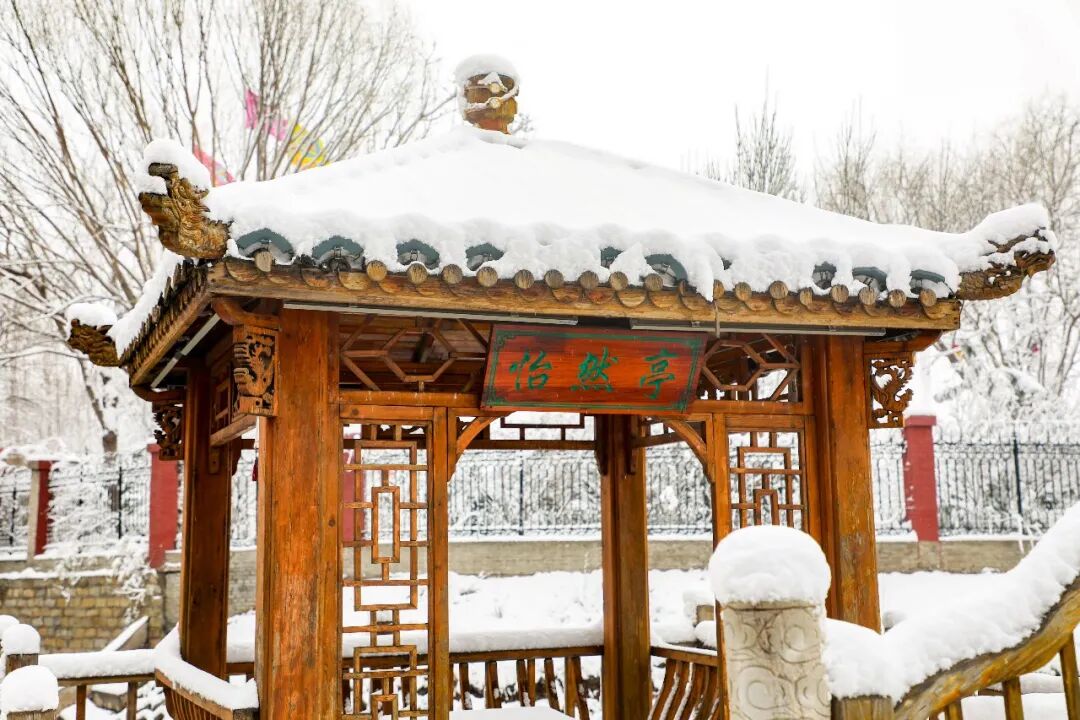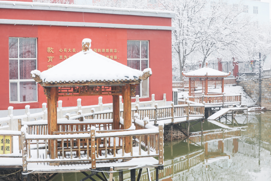 雪落校园,静谧如画。教学楼檐角堆雪,跑道覆上素白。亭台、草木、回廊,都被春雪温柔包裹。