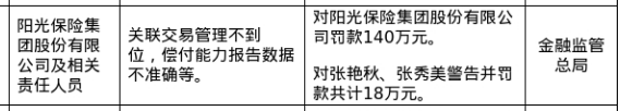 罚单显示,阳光保险集团股份有限公司的主要违法违规行为是:关联交易管理不到位,偿付能力报告数据不准确等。针对以上问题,国家金融监督管理总局对其罚款140万元;对相关责任人员张艳秋、张秀美警告并罚款共计18万元。