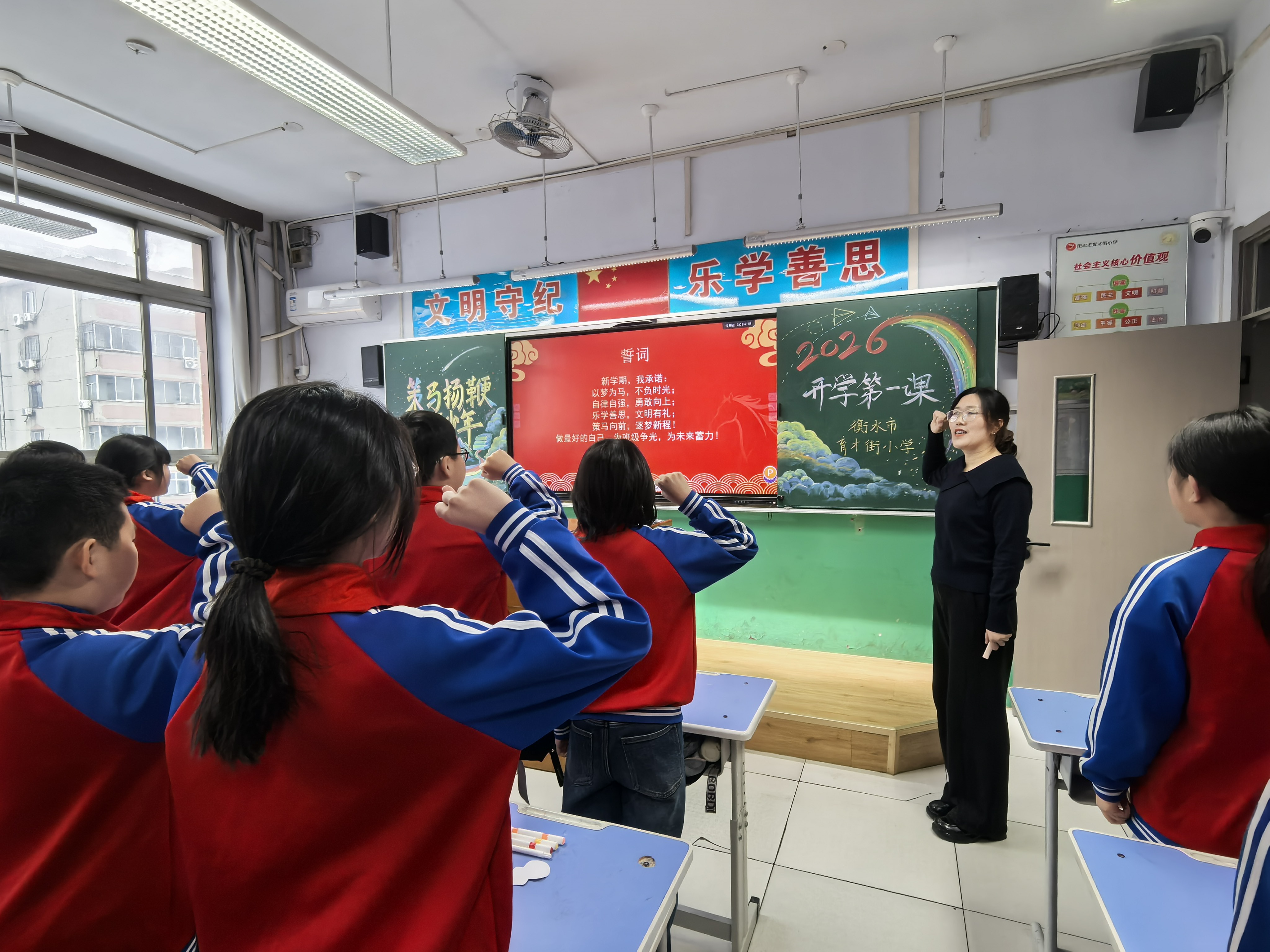 “新学期,我承诺:以梦为马,不负时光;自律自强,勇敢向上;乐学善思,文明有礼;策马向前,逐梦新程!”在老师带领下,全体同学整齐宣誓,声音响亮又坚定,充满对新学期的期待。