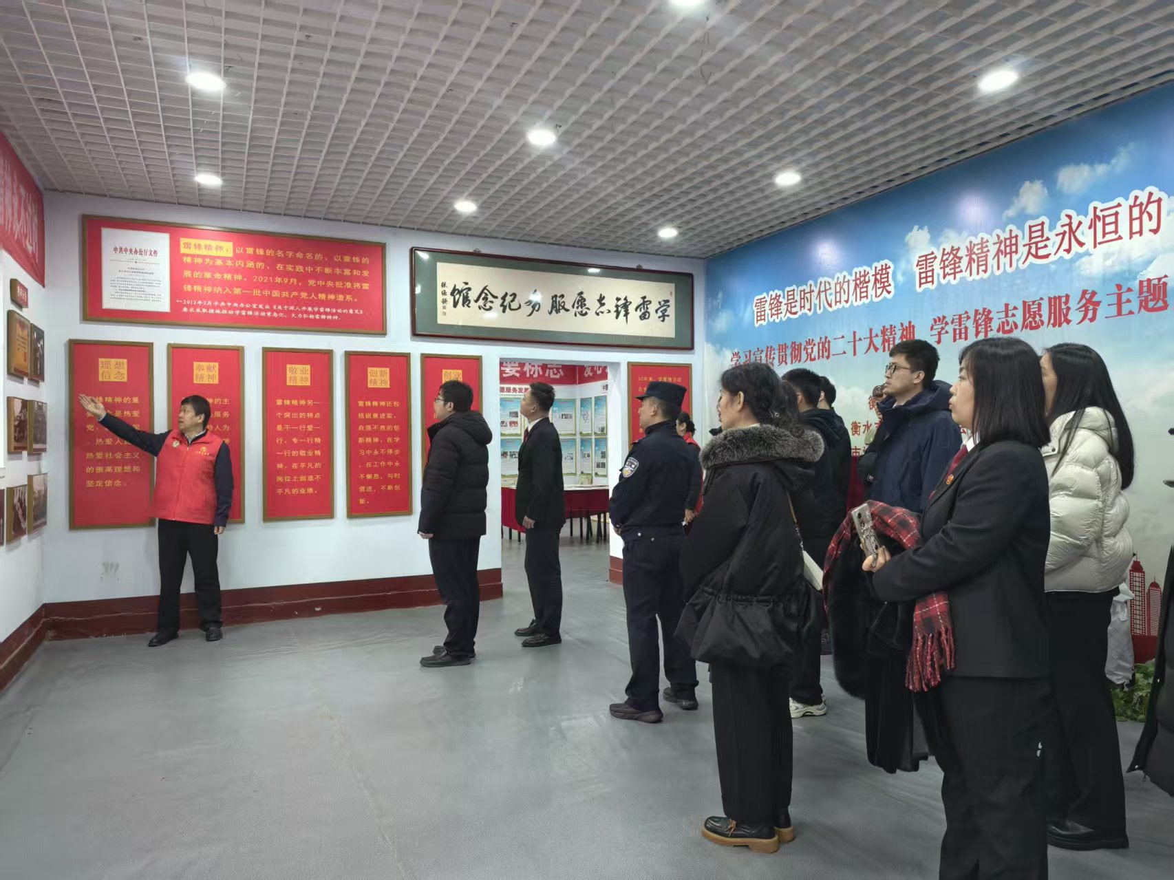 9时整,雷锋馆迎来了第一批参观队伍,志愿者王艳红为大家介绍场馆概况,随后带领众人齐声高唱《学习雷锋好榜样》,铿锵有力的歌声回荡在馆内,拉开了当日学习雷锋精神的序幕。
